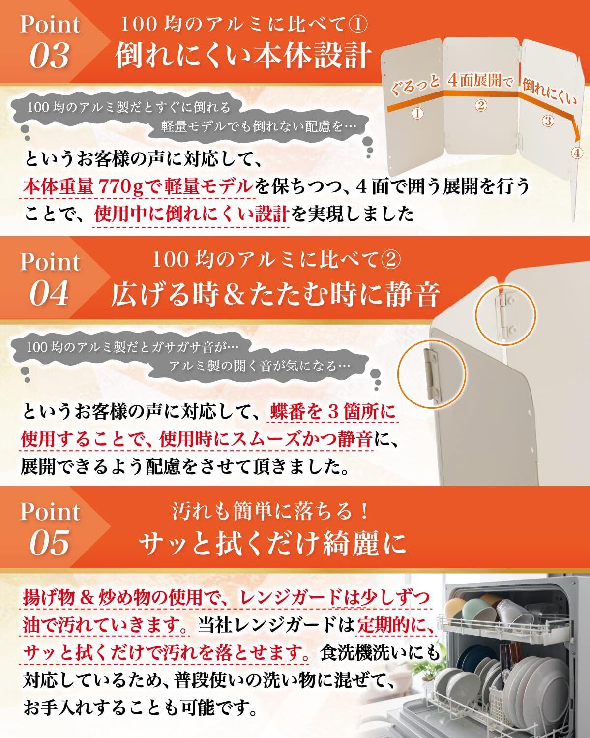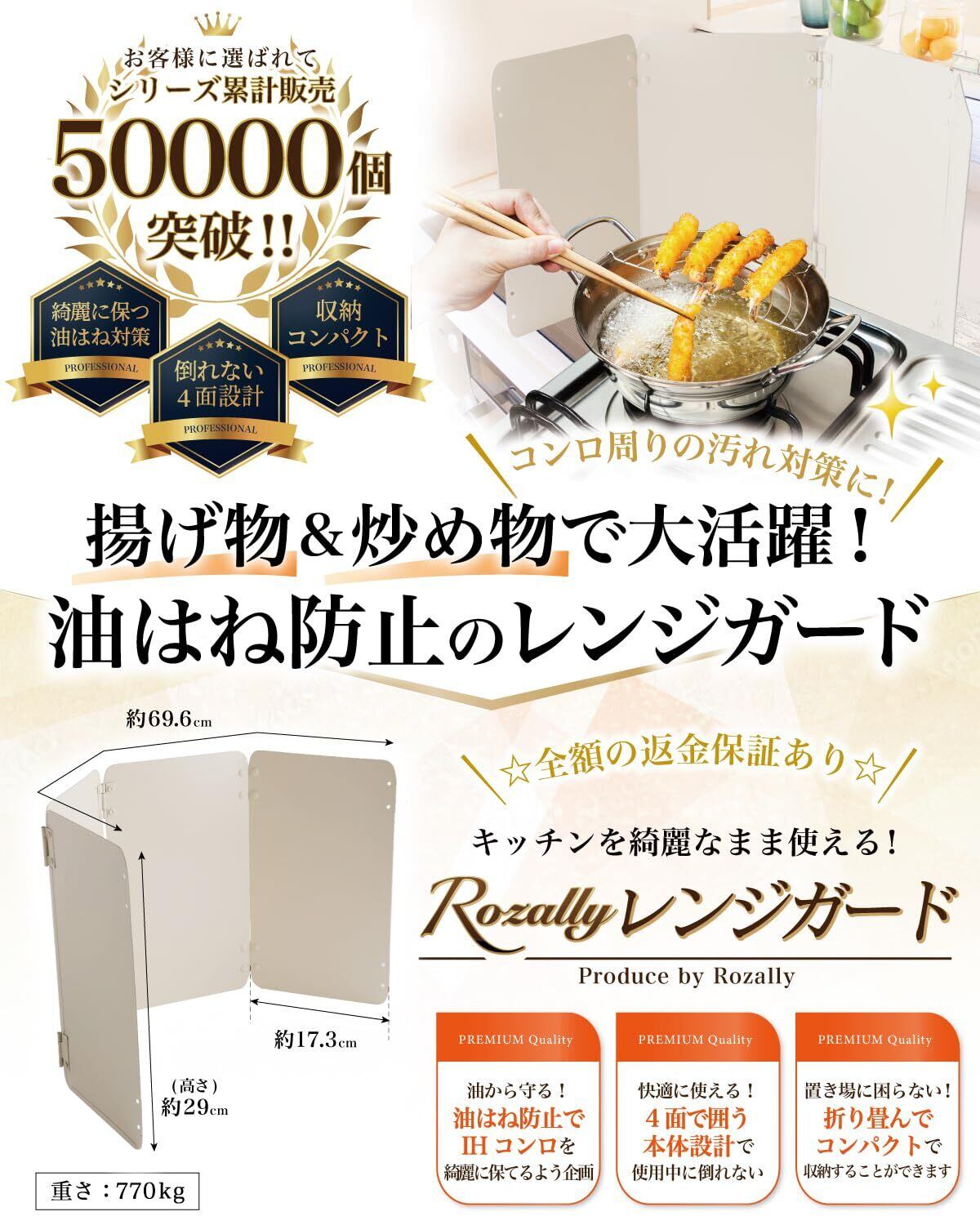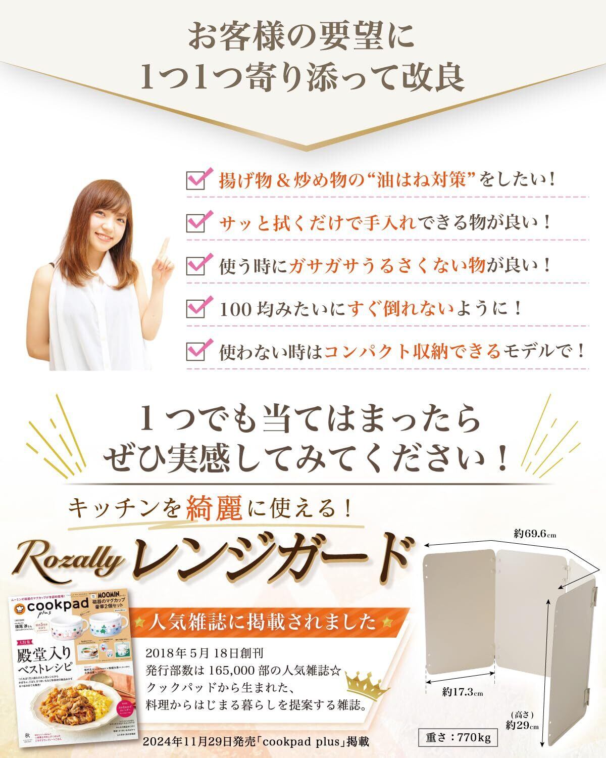【こだわり】 様々なメーカーから キッチン 用品として ” 油はねガード ”や” 油よけガード ”など 日本製/中国製など様々に販売されていますが、 Rozallyの レンジガード は”こだわり”が一味違います。 「4面折りたたみ式のコンパクト設計」で場所を取らず、 「食洗機にも対応」で簡単にお手入れすることができます。 キッチン用に色味もこだわり おしゃれ なホワイト(アイボリー)を採用しました。