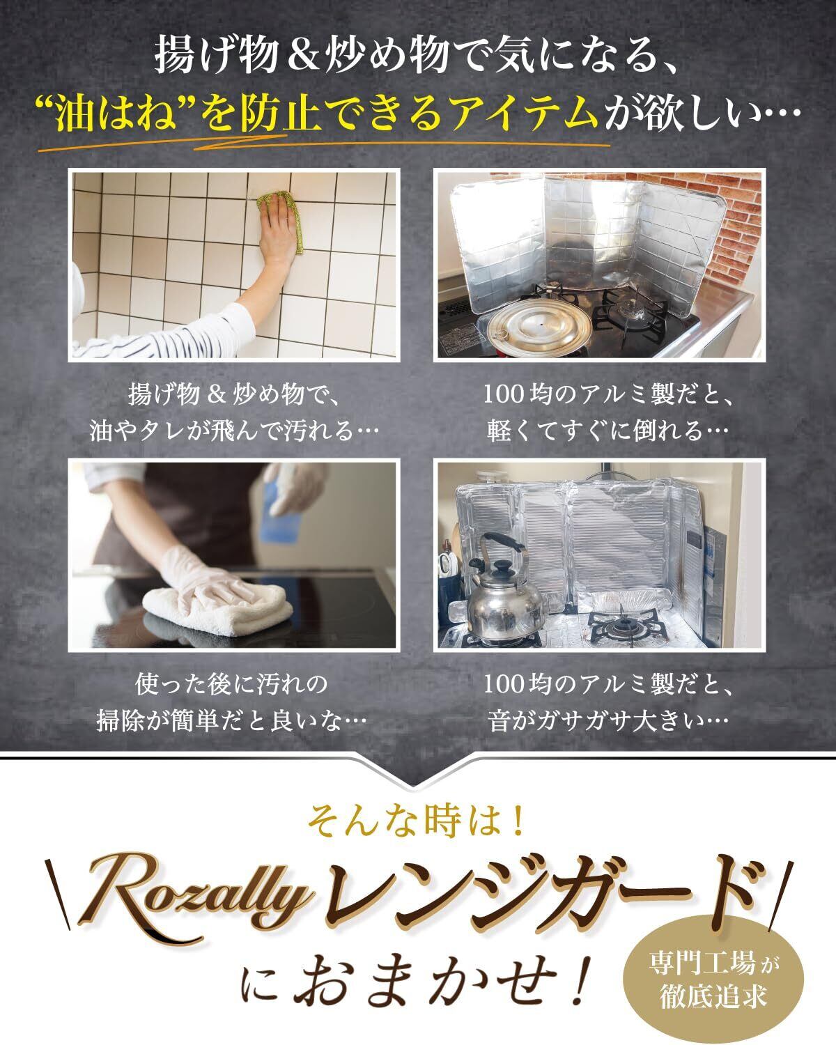 【油はねからレンジを守る】 Rozally レンジガード ( レンジ ガード ) がついに正式販売開始。 「油はね防止の折りたたみアイテムが欲しい」「油はねの掃除を楽にしたい」という お客様に人気の ステンレス 素材の 4面 折りたたみ の レンジガード です。 「ガスコンロが油はねで汚れないように…」「新築のIHコンロを綺麗に保ちたい…」 そんなお客様の声から生まれたコンロを油はねから守るレンジガードです。