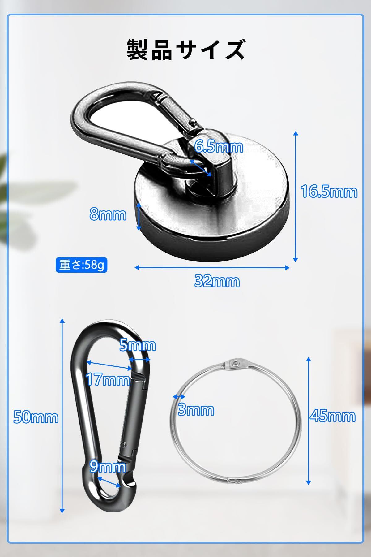 【商品仕様】カラビナ磁石×8、鉄のリング×8。マグネットフックサイズ:直径32mm、高さ18.5mm、マグネット厚さ8mm、重量58g、垂直荷重42kg。 素材: ネオジム磁石、強力磁石。