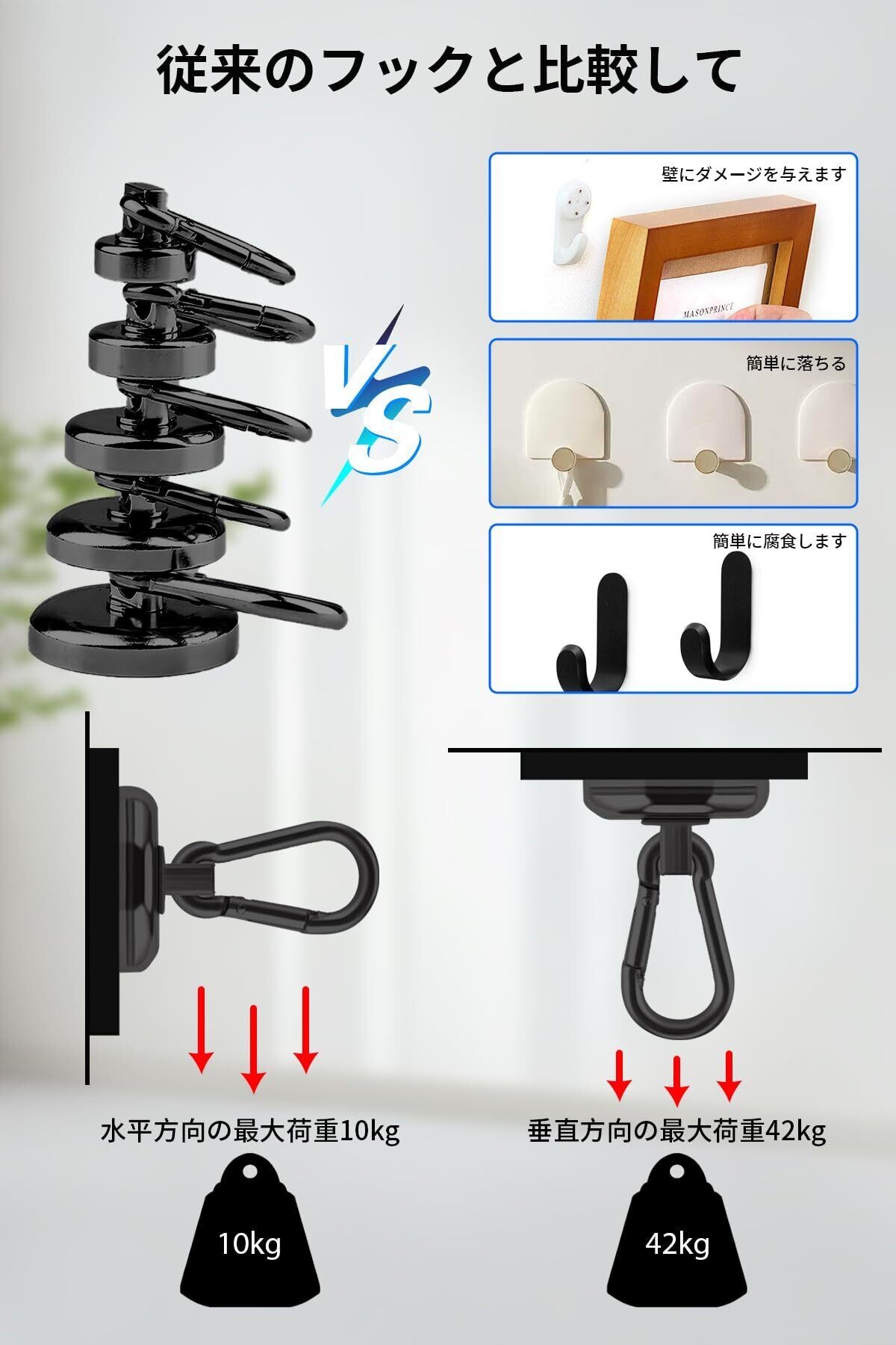 【強力な磁力 強力な耐荷重能力】当社のマグネット フック、集中的な吸引力を生み出す超強力なネオジム磁石で作られています。磁化飽和、強力な磁力、その磁力は従来の磁石の約 10 倍、コンパクトな構造、高負荷を運ぶことができ、自重の何百倍もの物体を引き寄せることができる