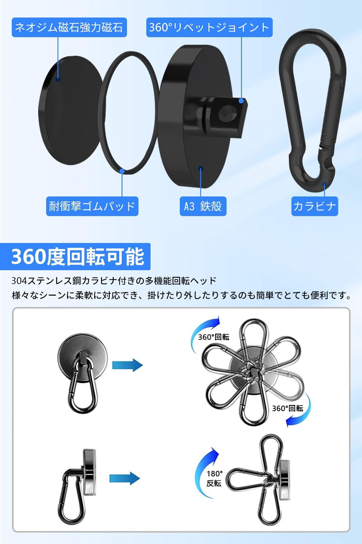 【高品質の素材 防食・防錆】 マグネットフックは新しいアップグレードプロセスを採用してマグネットの強度を高め、破損の問題を大幅に軽減し。 高品質のネオジム強力磁石が内蔵されています。 360°リベットジョイントは304ステンレス鋼のカラビナと一致しており、さまざまなシナリオに柔軟に使用できます。吊り下げや取り外しが簡単で、非常に便利です。 外装はA3鉄シェルで作られており、底部には耐衝撃ゴムパッドが装備されており、衝突防止および落下防止、錆のない長期使用、腐食なし、滑らかな表面、明るく美しい。