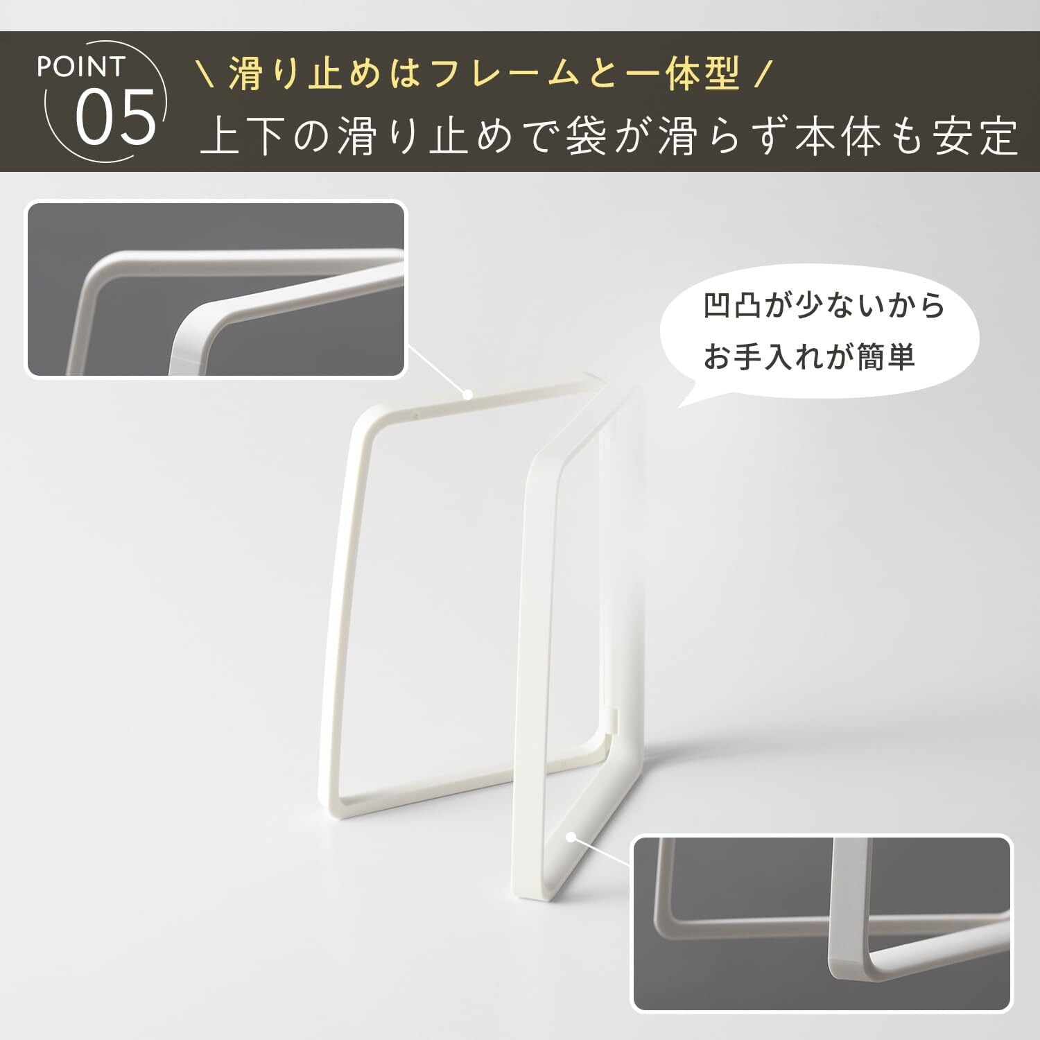 【滑り止め一体型で安定感抜群】フレームの上下についた一体型の滑り止めでパーツの脱落もなく、袋が滑らず本体も安定します。中身が少量であれば閉じたり、フレームの開きを小さく調整することもでき、狭いスペースでもかさばらずに使えます。