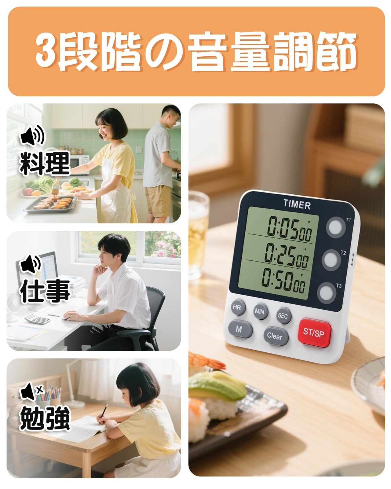 【多段階音量、無音モード】 高・低・ミュートの3段階音量設定に対応したデジタルタイマー。学習タイマーとして、タイマー キッチンでの調理など、幅広いシーンで活躍します。特に無音タイマー機能では、ミュート時に赤色点滅ライトでお知らせするため、静かな環境での勉強集中を妨げません。高音量設定なら、騒がしい場所でもクリアに聞こえ、通知を確実に受け取れます