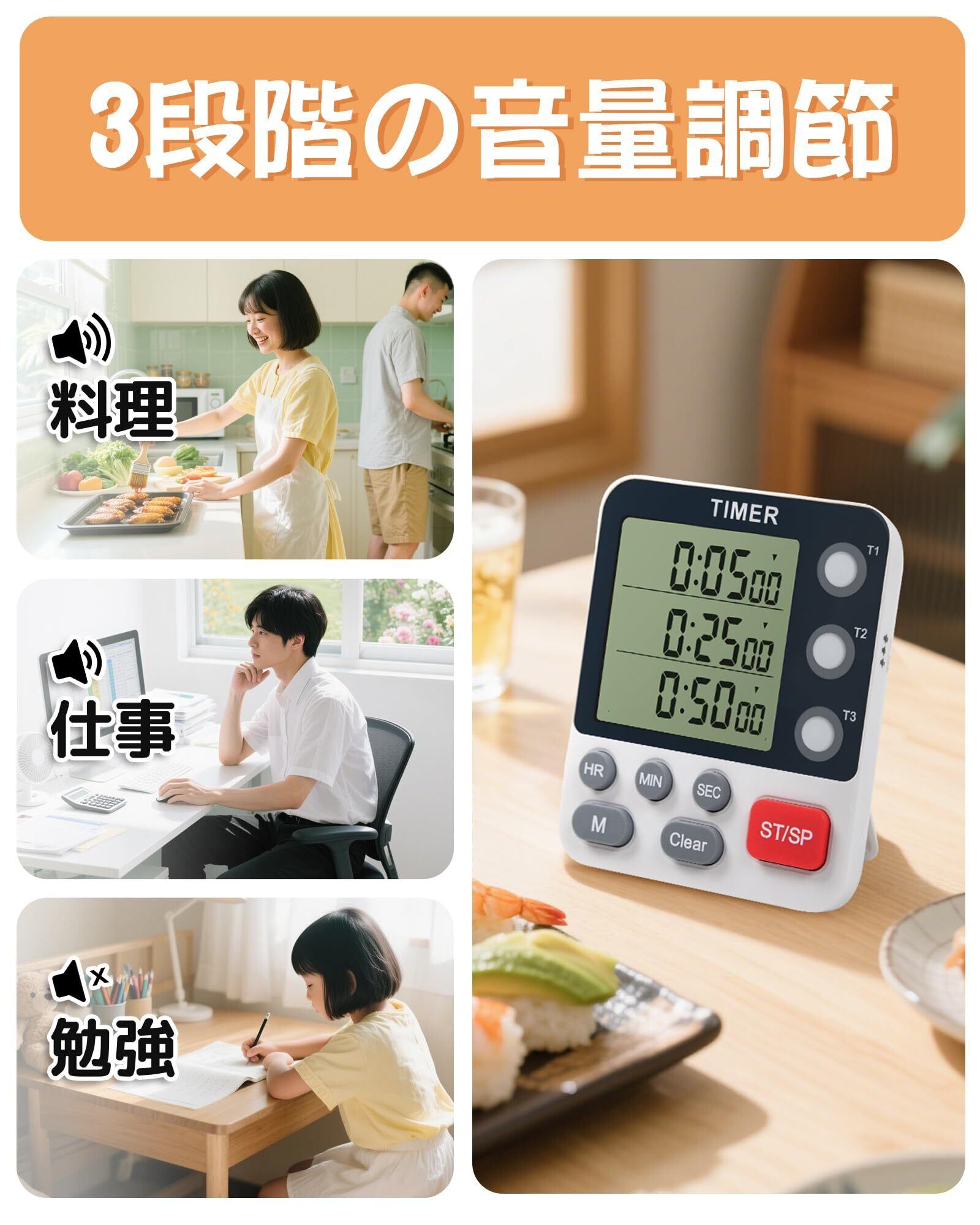 【3チャンネル大画面、見やすい】 大型LEDディスプレイで数字が大きく鮮明、非常に見やすい多機能マグネット付きキッチンタイマーです。3つの独立タイマーを同時に作動でき、複数タスクの管理も簡単。キッチンでの調理はもちろん、勉強タイマーや学習計画など、様々な場面で活躍します