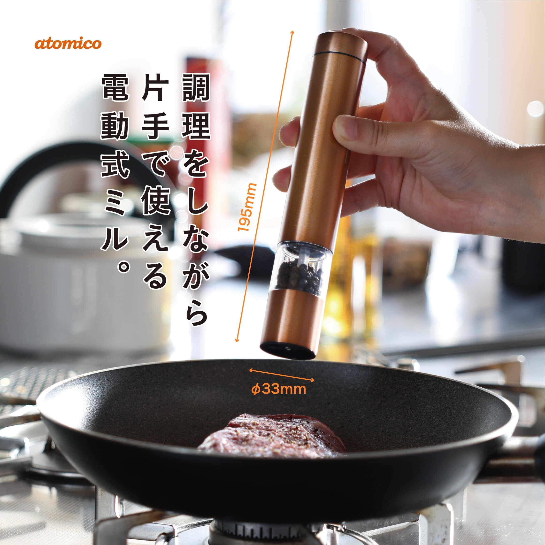 スイッチを押すだけで誰でも簡単にスパイスを挽ける「atomico(アトミコ)ソルト&ペッパー電動ミル」電動式なので料理中も手を休めることなく、さっと片手で挽きたての新鮮なスパイスを楽しめます。