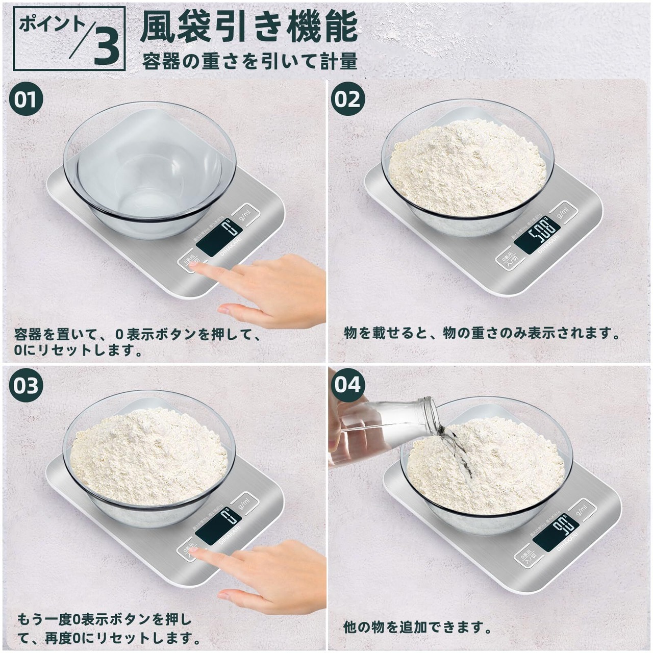 【計量範囲3g-5kg、最小表示1g&多機能】電子秤は、1g単位の高精度で最大5kgまで対応可能。内蔵された4つの高感度センサーにより、わずかな重量変化も正確にキャッチし、精密な計量が求められるシーンでも安定した信頼性を提供します。多機能の計量器:風袋引き、mlモード、オートオフ(1分、2分、3分またはキャンセル可能)、重量オーバー提示、バッテリー不足提示機能があります。