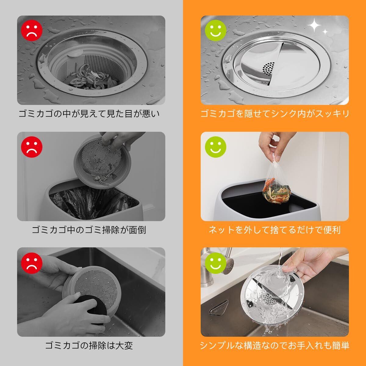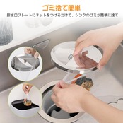 【ゴミ捨て簡単】カゴはいらず、排水口プレートにゴミ受けネットをつけるだけで、シンクのゴミが簡単に捨てられます。