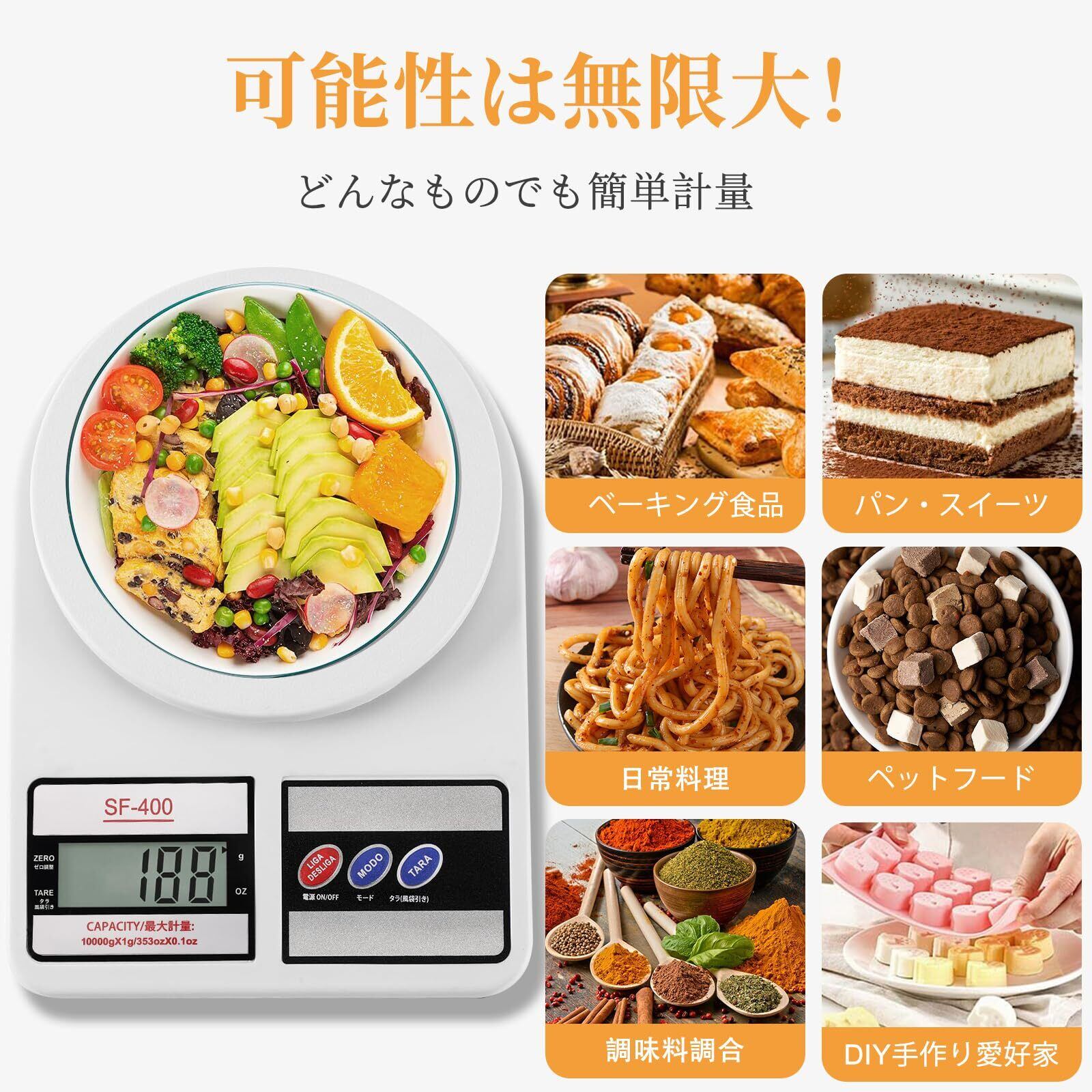 【高精度センサー電子秤】1g単位で高精度測定が可能、最大計量量は10kgです。少量のスパイスから大量の材料まで計量に便利で、コーヒー、ペットフード、薬品、スパイス、郵便物、料理、デザート作りに使用できます。家庭用サイズでプロ級の精度を提供します。
