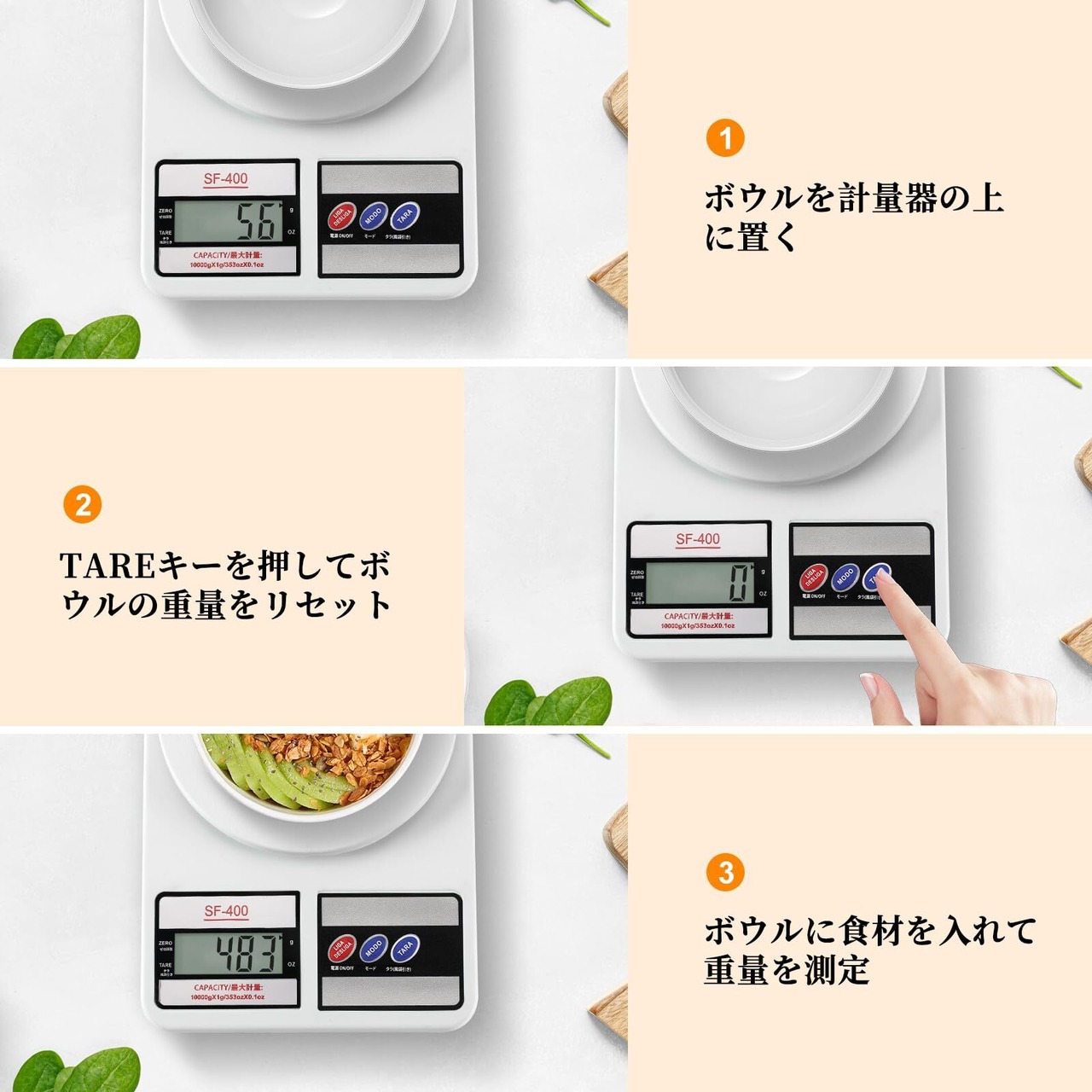 【風袋引き機能&滑り止め】風袋引き機能があります。使用方法:①ボウルを秤に置く ②TAREボタンを押してボウルの重量をリセット ③計量したい物をボウルに入れて重量を測る。電子秤の底面四隅には滑り止めが付いています。