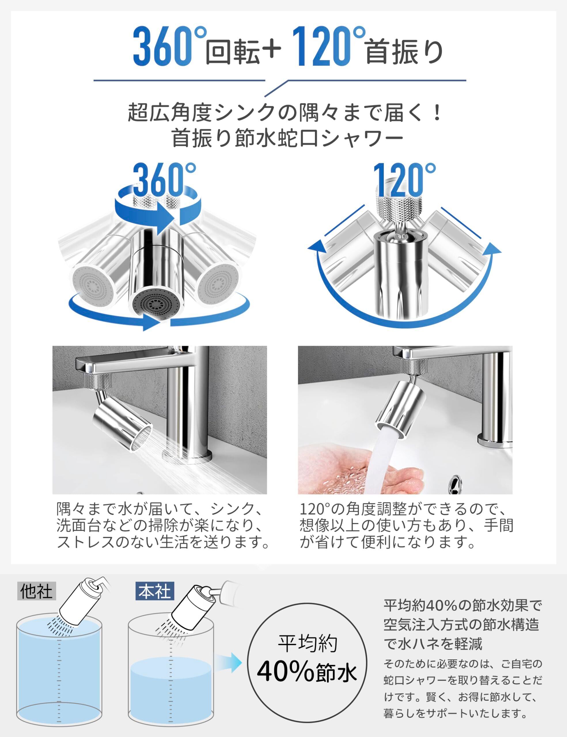 蛇口シャワーヘッド 水道 蛇口 シャワー 【首振り自在・節水率約40%・切替簡単】 首振りシャワーヘッド 節水 蛇口 先端 キッチン蛇口シャワー 後付け 水はね防止 水漏れ対策 切替可能 回転式 キッチン 浴室 台所 シンク 洗面台 トイレに適用 掃除 真鍮製 メッキ処理 外ネジ 内ネジ 交換アダプター シールテープ 取扱説明書付き (シルバー, TYPE-02(120°首ふり+360°回転))