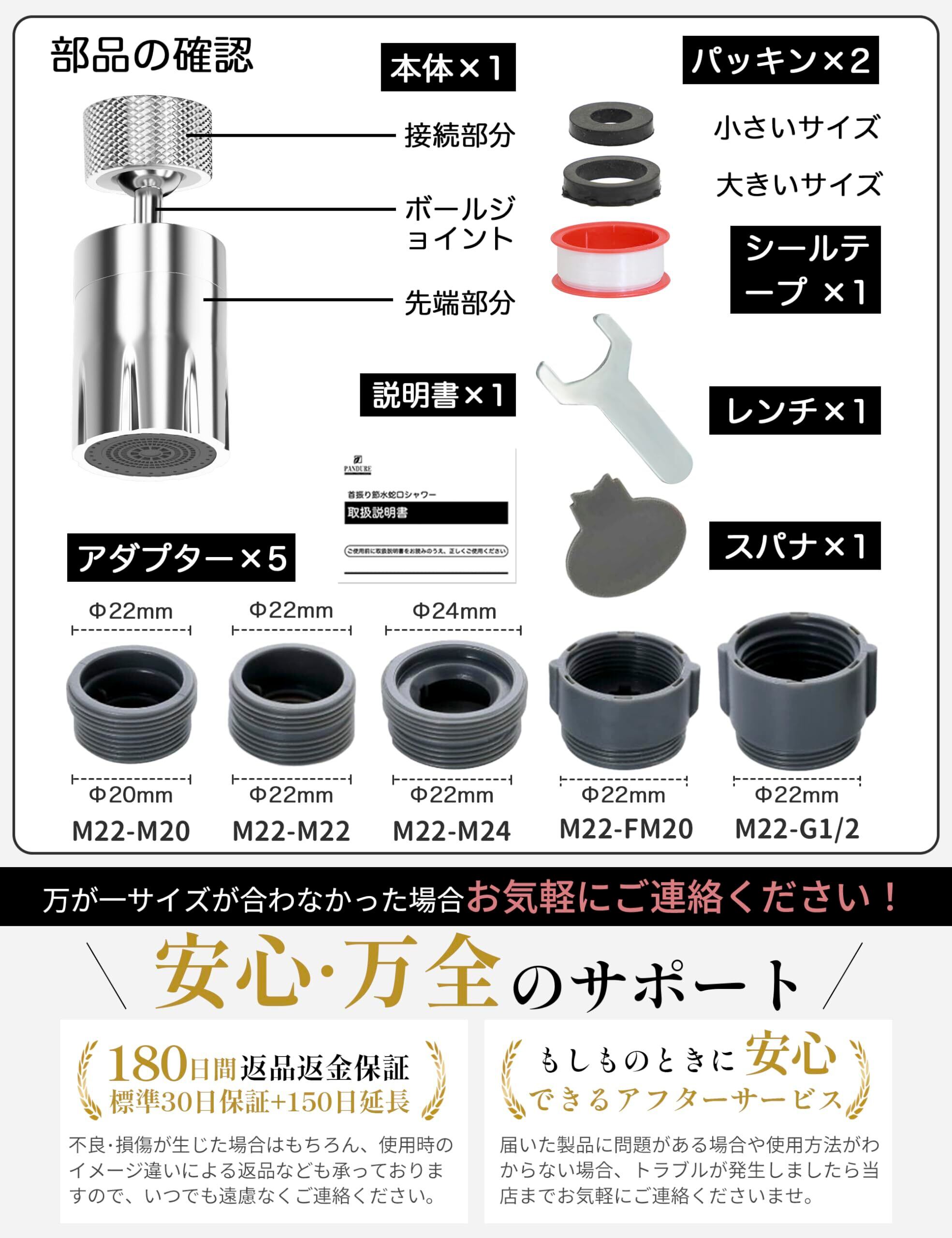 【様々な蛇口対応・取付簡単】節水シャワーヘッドは5種類のアダプターが付属しており、様々な蛇口に合わせて使えます。詳しい取り付け説明書が付属しており、開封から三つの手順で取り付けができます。【水漏れ対策】製品を取り付けた際に水漏れが発生した場合は、付属のパッキンとシールテープを利用してください。ただし、水道環境や取り付け状況によっては、漏水の原因が製品以外の要因による場合があります。このような場合については、は一切の責任を負いかねますので、予めご了承ください