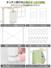 【こだわりのオリジナルデザイン】①16個フックで収納カさらにアップ。ミトンやエプロンなどをサッと掛けて収納するのに便利。②水やキズに強いメラミン天板、水をこぼしても、サッと拭き取るだけでOK。お手入れもカンタンです。③フレームは錆びにくい「パウダーコーティング」加工を施しています。マットな質感も魅力です。④床の微妙な段差や傾斜に対応できるよう、脚にアジャスターを付けました。⑤組立簡単!女1人で組み立てられます!わかりやすい説明書も付きます。