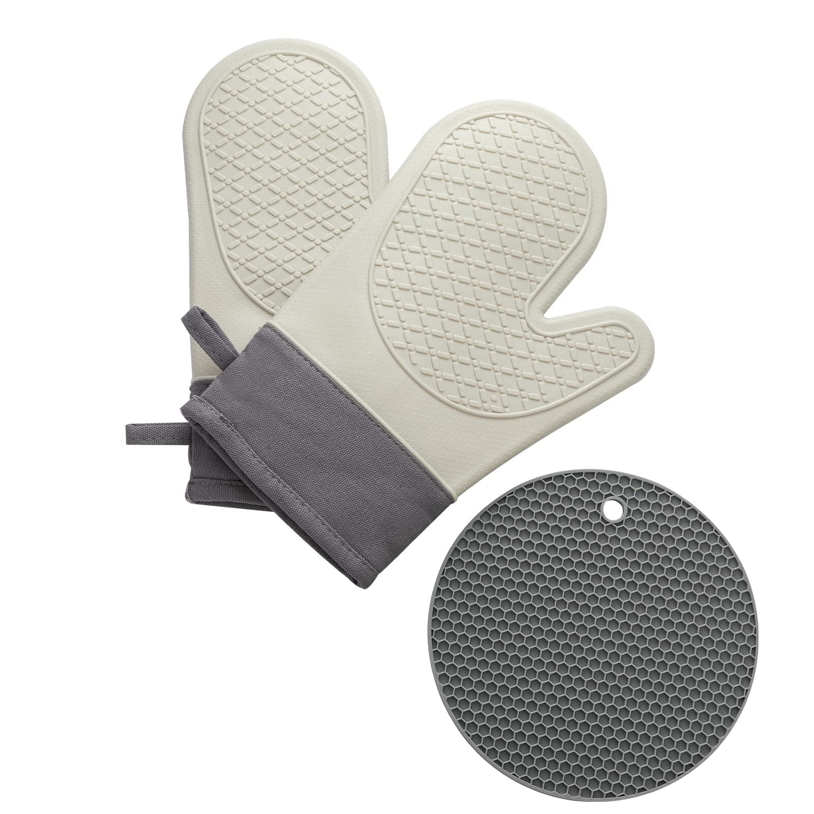 Senteria 耐熱ミトン 鍋つかみ オーブングローブ 300℃耐熱 グレー シリコン製 やけど防止 滑り止め 長持ち おしゃれ キッチン手袋 電子レンジ クッキング用 ケーキを焼く バーベキュー用 鍋料理 両手セット (ミトン+コースター)