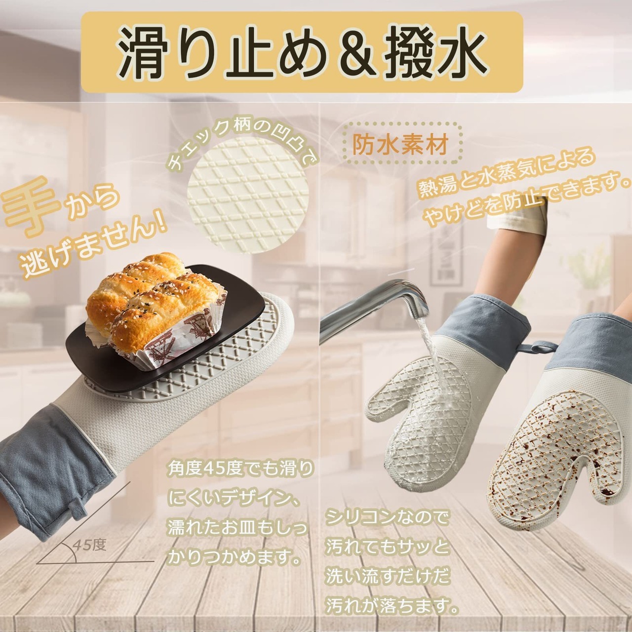 【滑り止め&防水】 ミトンと鍋敷きの表面にはシリコンが付いている凹凸になって、滑りにくく、食品や調理器具が手から逃げません。そして、防水性能を併せ持ち、熱湯と水蒸気によるやけどなどを防止します。