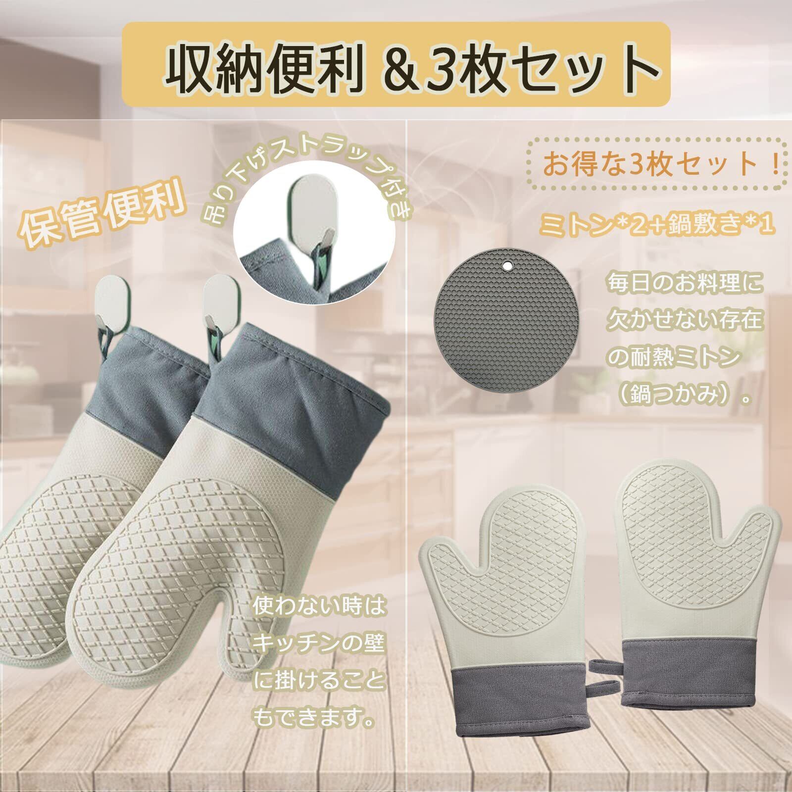 【商品仕様】ミトン:素材:シリコン+綿、サイズ:約28×19cm、カラー:グレー、耐熱温度:300℃、重量:約260g (2枚セット)。鍋敷き:素材:シリコン、サイズ:約18×6cm、カラー:グレー、耐熱温度:-40℃~230℃、重量:約63g (1枚のみ)。お得な3枚セット!ご注意:メーカーによって、ミトンや鍋敷きのカラーが異なります。