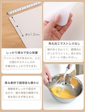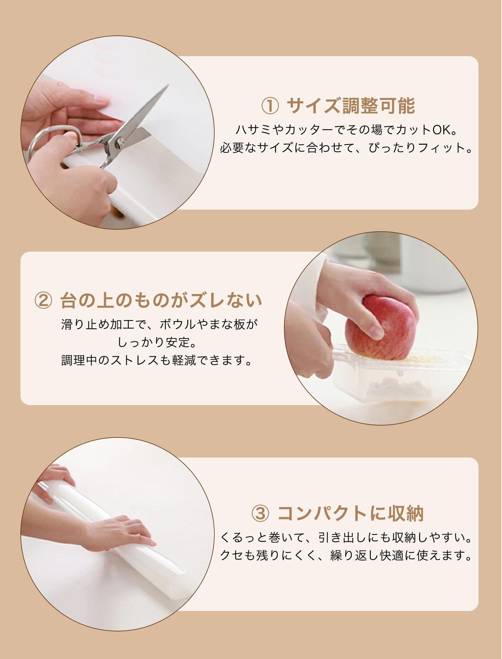 ① 【調理中の安定感をサポート|滑り止め加工でズレにくい】 裏面はしっかり密着する滑り止め仕様のシリコンマット。まな板やボウルが滑らず、調理中の安定感が向上。