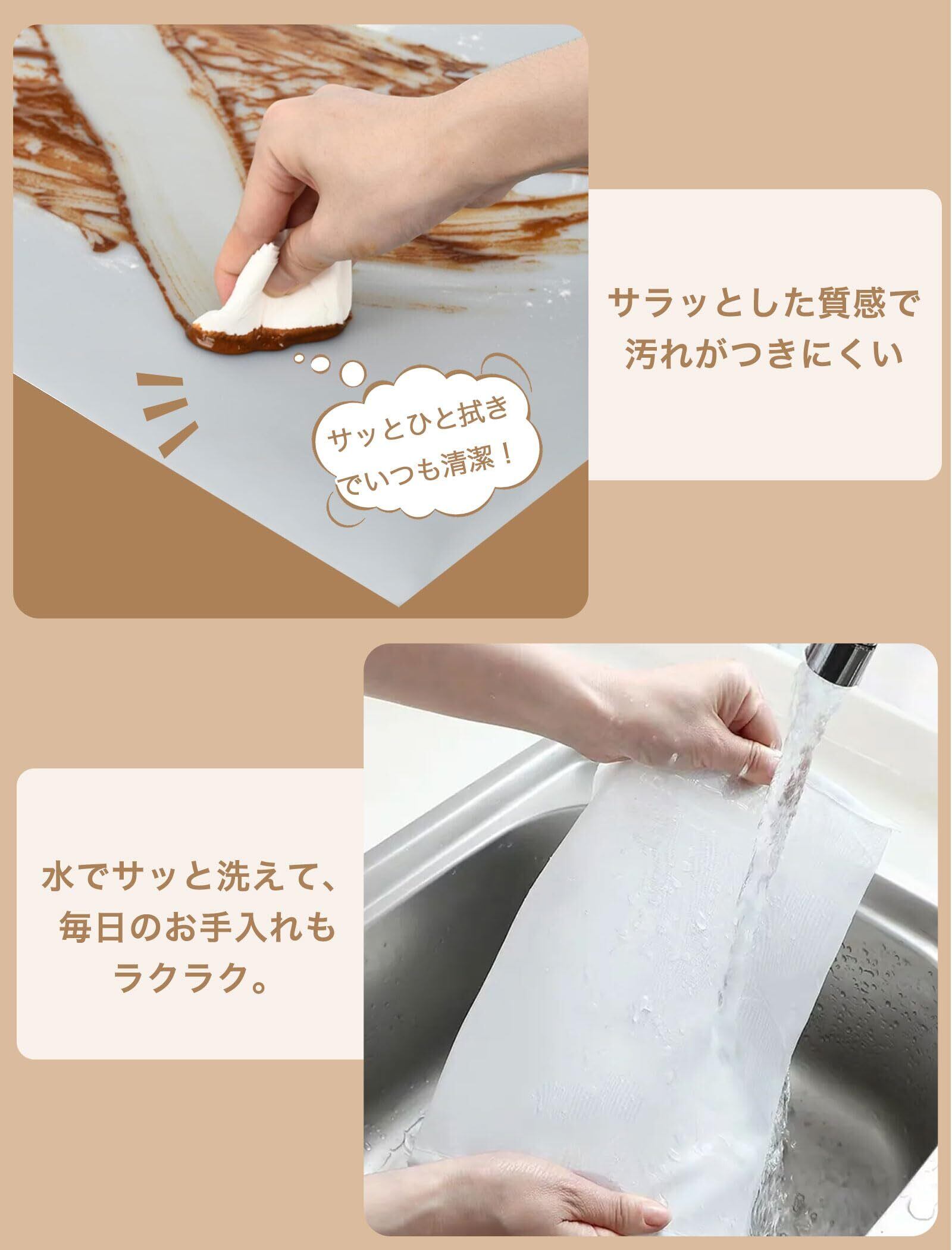 【防汚・お手入れ簡単|水洗い&食洗機対応】 表面はサラッとした質感で汚れがつきにくい加工付き。こぼれた調味料や油汚れもサッと拭くだけでOK。水洗いや食洗機対応マットとして毎日清潔に保てます。