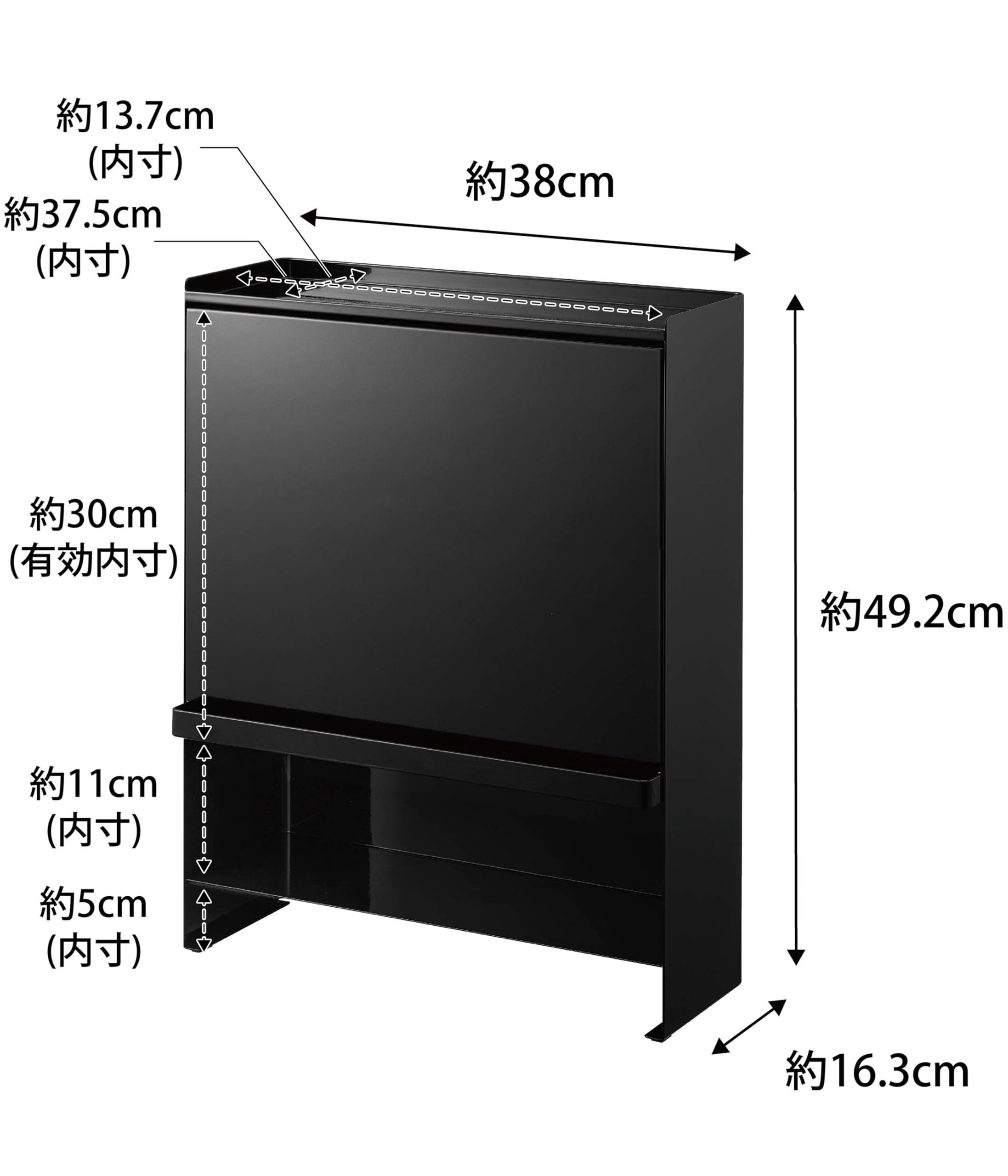 商品サイズ:約W38×D16.3×H49.2cm ・内寸:天板:約W37.5×D13.7cm 収納部上段:約W37.5×D13.7×H30cm(ローラー部分含まず) 収納部下段:約W37.5×D13.7×H11cm マグネットスパイス棚:約W17.7×D12cm