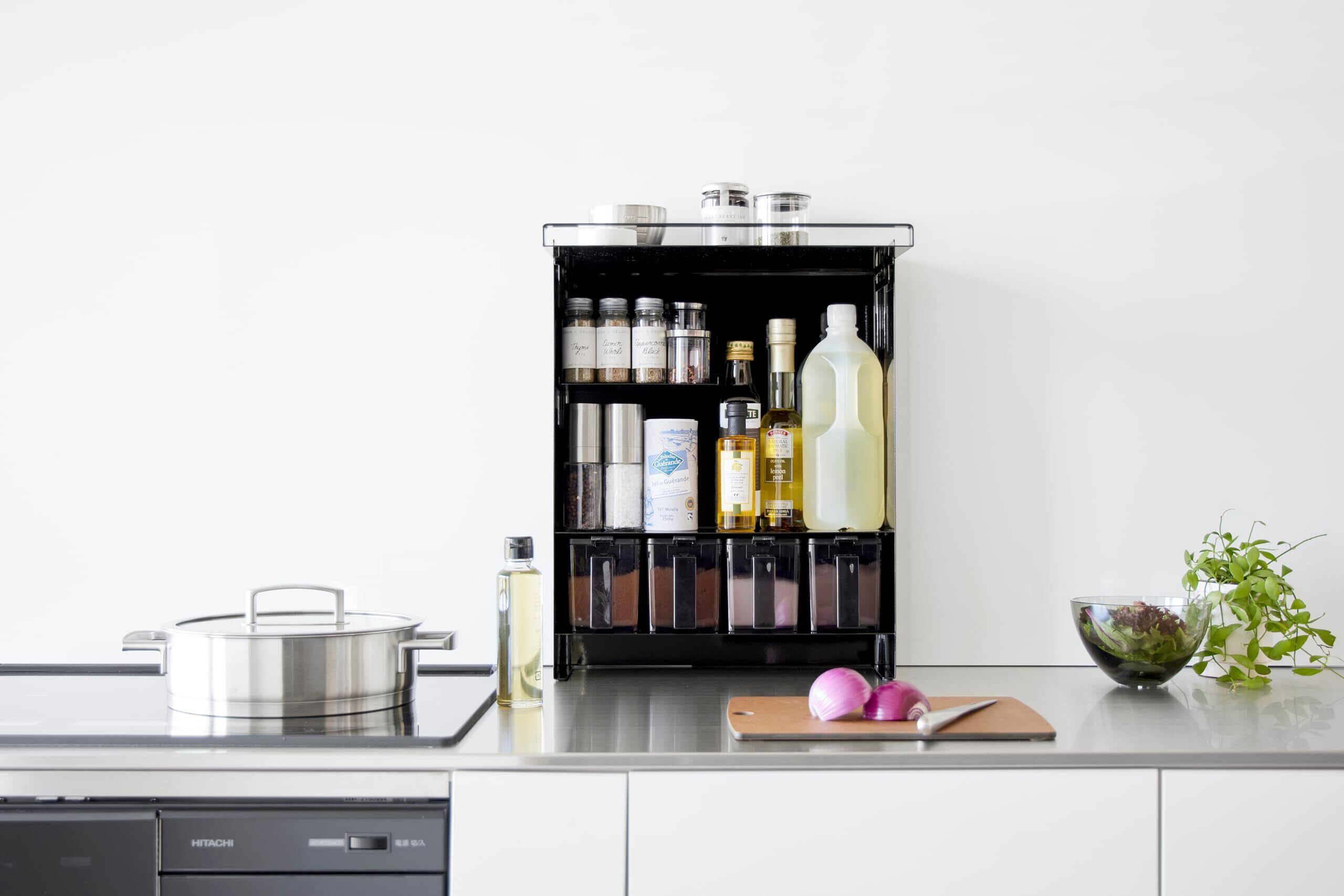 調味料ボトルやスパイス類を隠して一括収納!汚れからガードします。