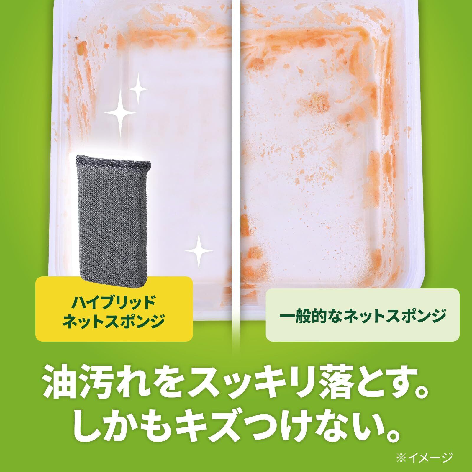 【2つのパワーで頑固な汚れもスッキリ落とす!】2種類のネットが油汚れを拭き取り、こびりつき汚れをかき取るハイブリッドネットスポンジ。しつこい汚れやヌメリがラクに落とせます。