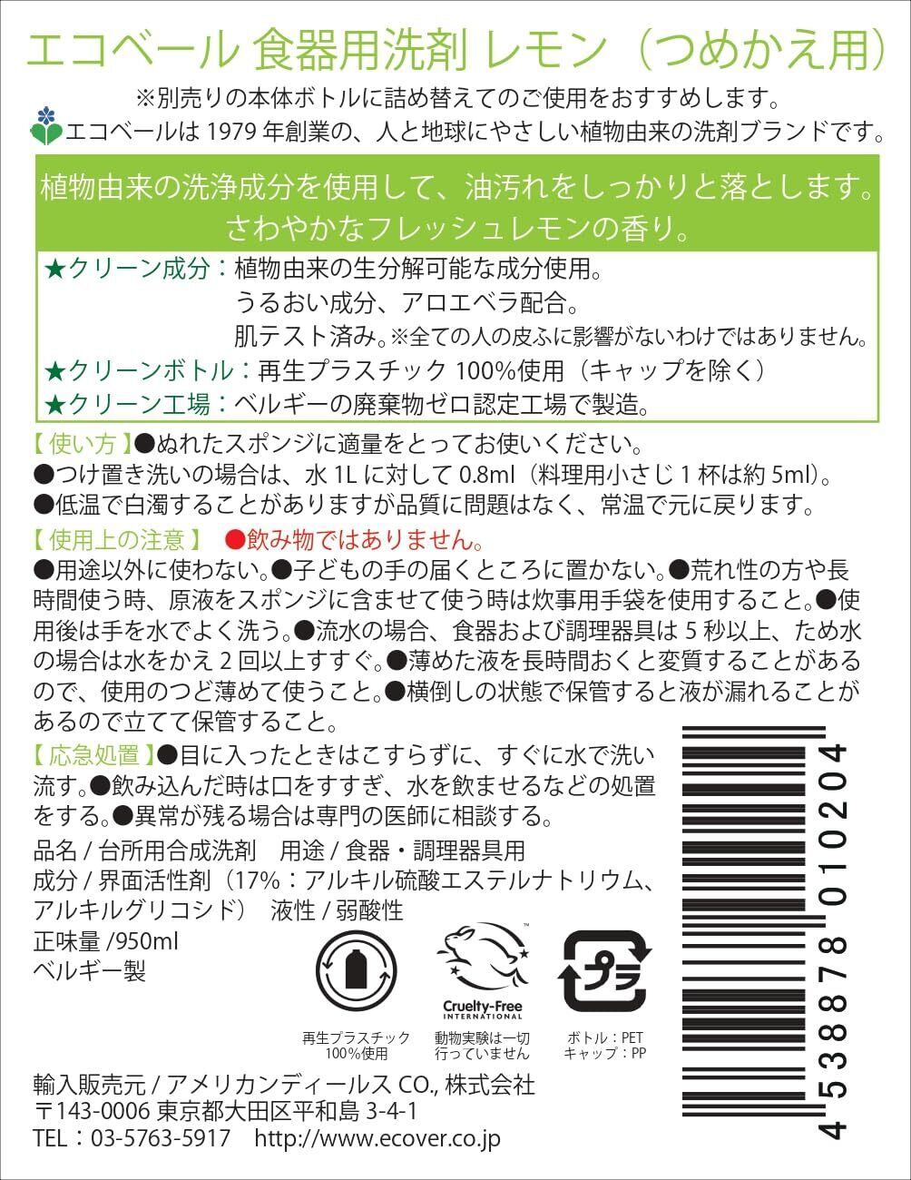 【まとめ買い】ECOVER(エコベール) エコベール 食器用洗剤 詰め替え用 レモンの香り 950ml×2個 大容量 ecover 手に優しい 植物由来 赤ちゃん 食器 キッチン洗剤 台所用 油汚れ