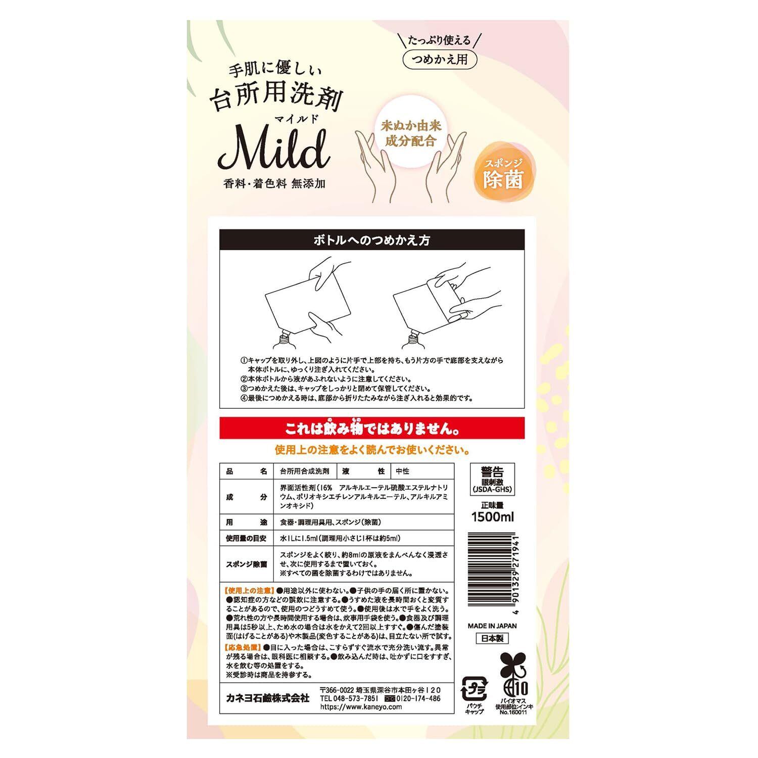 カネヨ石鹸【大容量】台所用洗剤マイルド 1500ml 香料・着色料無添加 米ぬか由来成分配合 スポンジ除菌 日本製