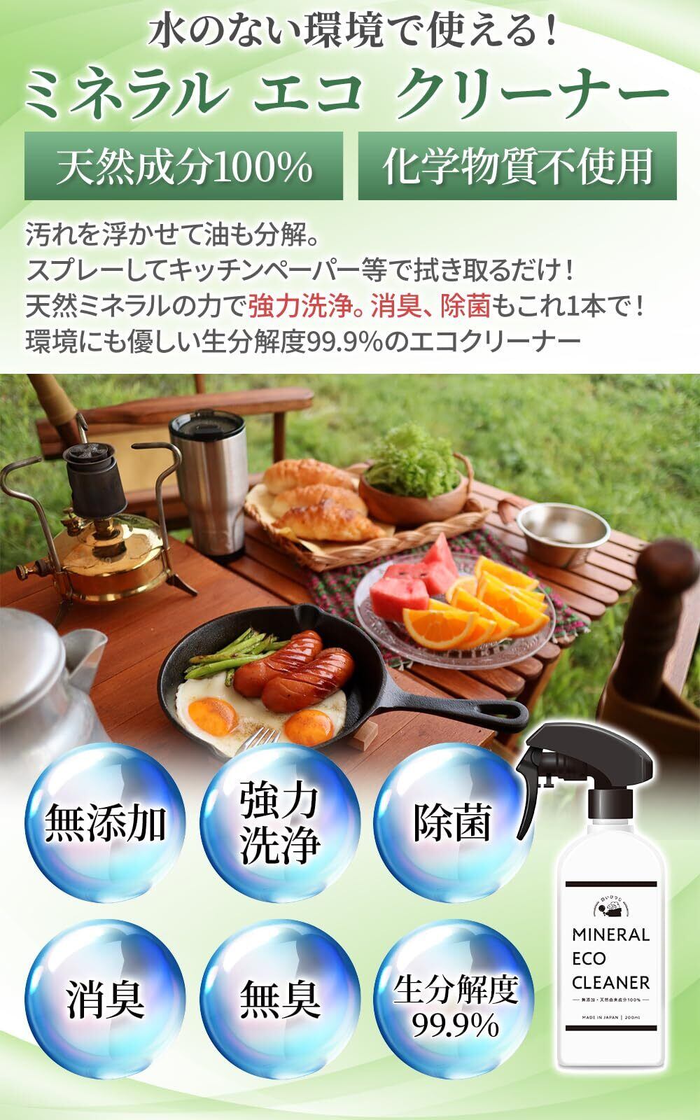 【簡単清掃】拭き取るだけで油や汚れをすばやく落とすことができるミネラルエコクリーナー。除菌、消臭効果もあり。アウトドアやキャンプの食器洗い時間を短縮。水を使わずにキッチンペーパーなどで拭き取るだけで、油汚れや臭いが簡単に落とせます。あとは自宅になどに帰ってからサッと水で流すだけ。 冬の寒い洗い場や水場が混んでいても、汚れだけ落としてお家などでサッと水洗いすれば良いので、後片付けが簡単にすみます。 使い方はシンプルで、スプレーしてキッチンペーパー等拭くだけ! ご家庭ではキッチン周りの油汚れに強いキッチンクリーナーとしても使えるマルチ洗浄剤です。 汚れがひどい場合はスプレー後、1分ほど置いてからふき取ってください。また消臭効果はふき取り後、時間の経過後とともにあらわれます。