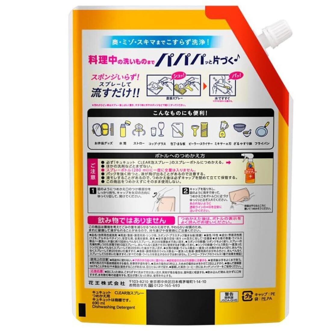 (2個セット)キュキュット clear 泡スプレー オレンジの香り つめかえ用 690ml 消臭 くすみ落とし 食器用洗剤 クリア泡スプレー 業務用