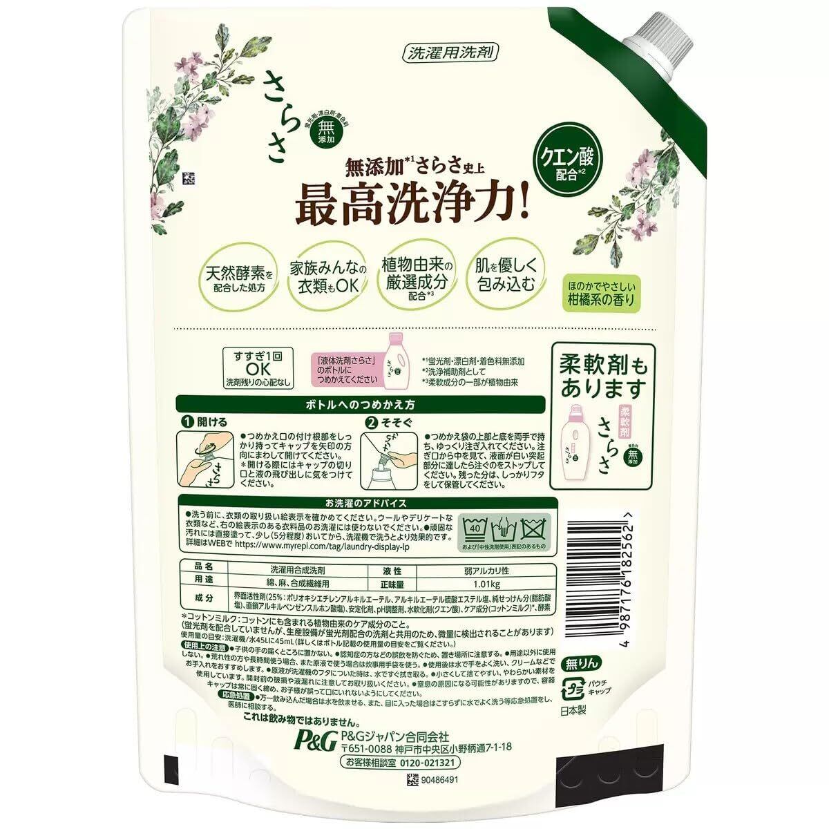 メーカー P&G ブランド さらさ お得なセット販売 1010g x2セット ほのかで優しい柑橘系の香り 液体洗剤さらさは、無添加* さらさ史上最高洗浄力!(蛍光剤、漂白剤、着色料無添加) 皮膚科医監修のもと、肌テスト済み*。肌に優しい。(*全ての人の肌に影響がないわけではありません) 天然酵素を配合。汚れを落として、本来の白さへ。(*汚れ落ち洗浄試験で評価)