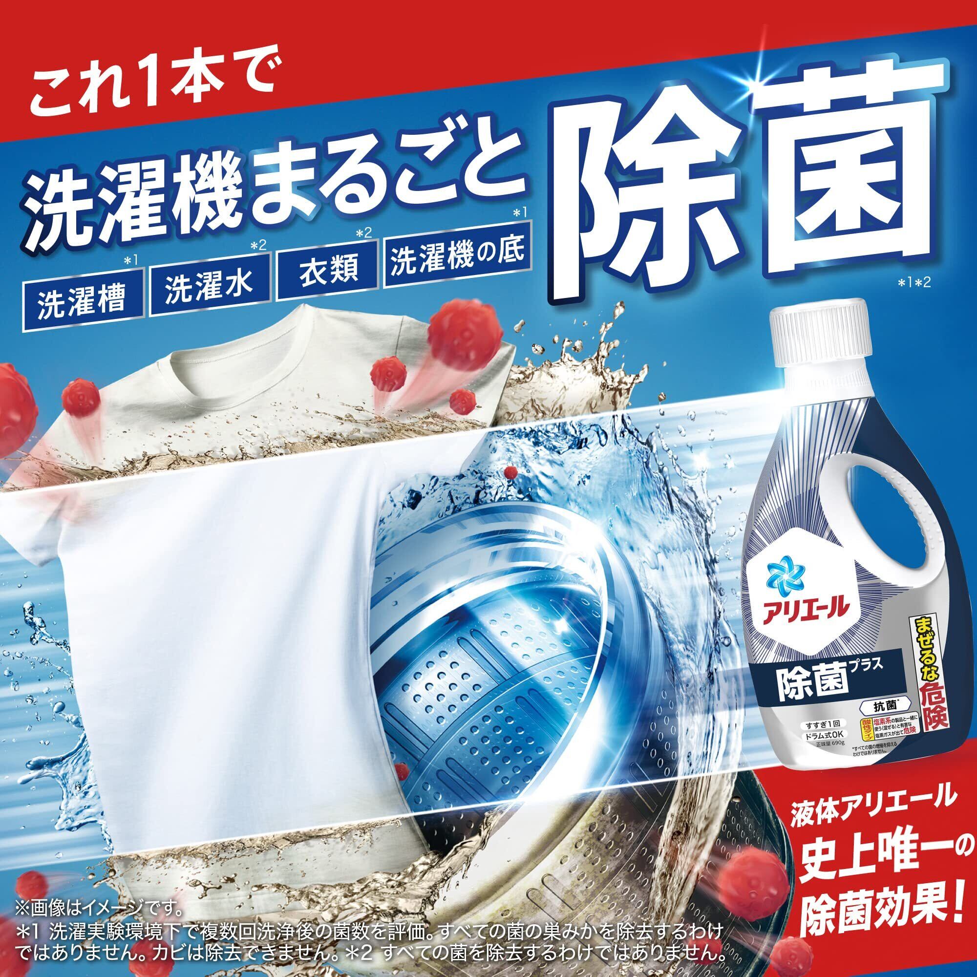 除菌*1も、抗菌*2もどちらもできる「アリエール除菌プラス」がさらに生まれ変わった! (*1すべての菌を除菌するわけではありません。*2すべての菌の増殖を防ぐわけではありません。)