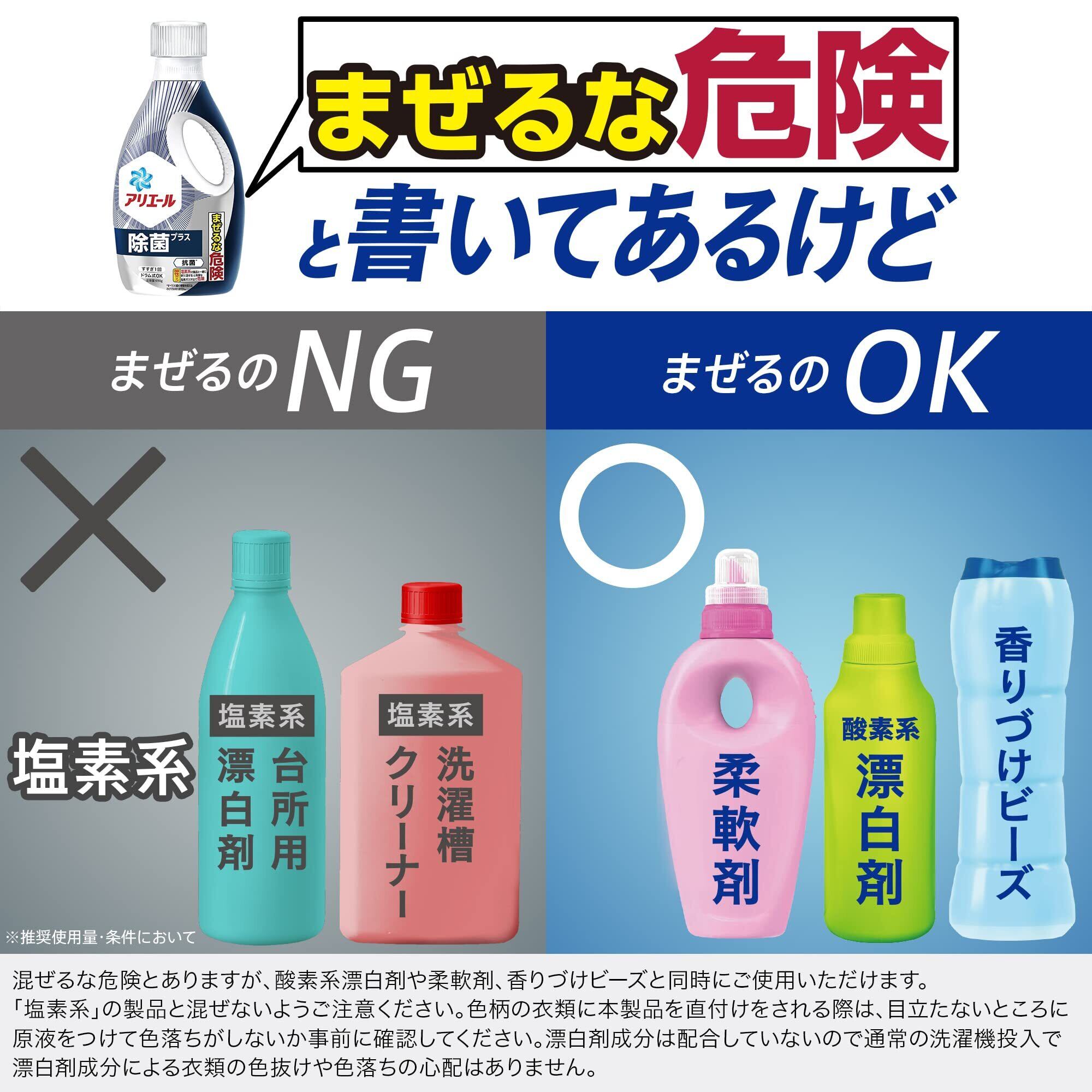 気になる汗のニオイや、部屋干しで感じる生乾き臭まで、「アリエール除菌プラス」はまるごと消臭! 混ぜるな危険とありますが、酸素系漂白剤や柔軟剤、香りづけビーズと同時にご使用いただけます。「塩素系」の製品と混ぜないようご注意ください。色柄の衣類に本製品を直付けをされる際は、目立たないところに原液をつけて色落ちがしないか事前に確認してください。
