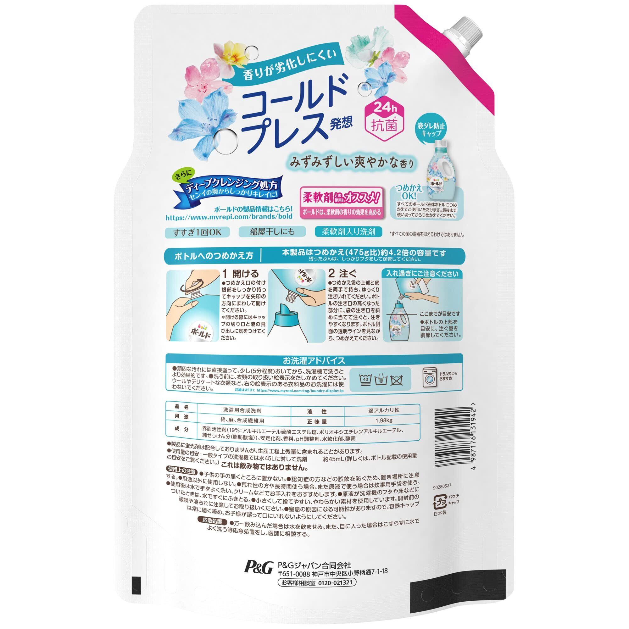柔軟剤入り洗剤 24h抗菌* さらにディープクレンジング処方センイの奥からしっかりキレイに! *すべての菌の増殖を抑えるわけではありません。香りが劣化しにくいコールドプレス発想 しっかり洗浄+香り華やか 部屋干しにも 液ダレ防止キャップ ボールドは、柔軟剤の香りの効果を高める。柔軟剤との使用もオススメ! すすぎ1回OK つめかえOK! 洗濯洗剤
