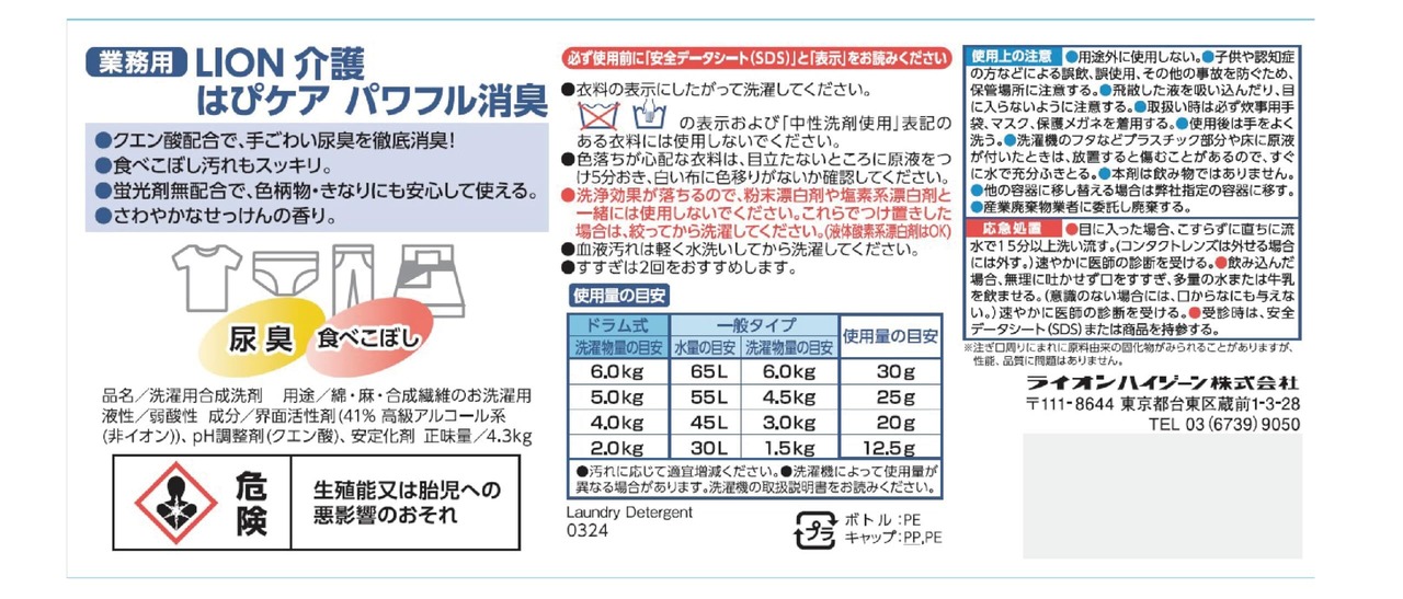 【業務用 大容量】 LION 介護 はぴケア パワフル消臭 4.3kg ライオン 洗濯洗剤 詰め替え せっけんの香り クエン酸 尿臭除去 保育 ペット