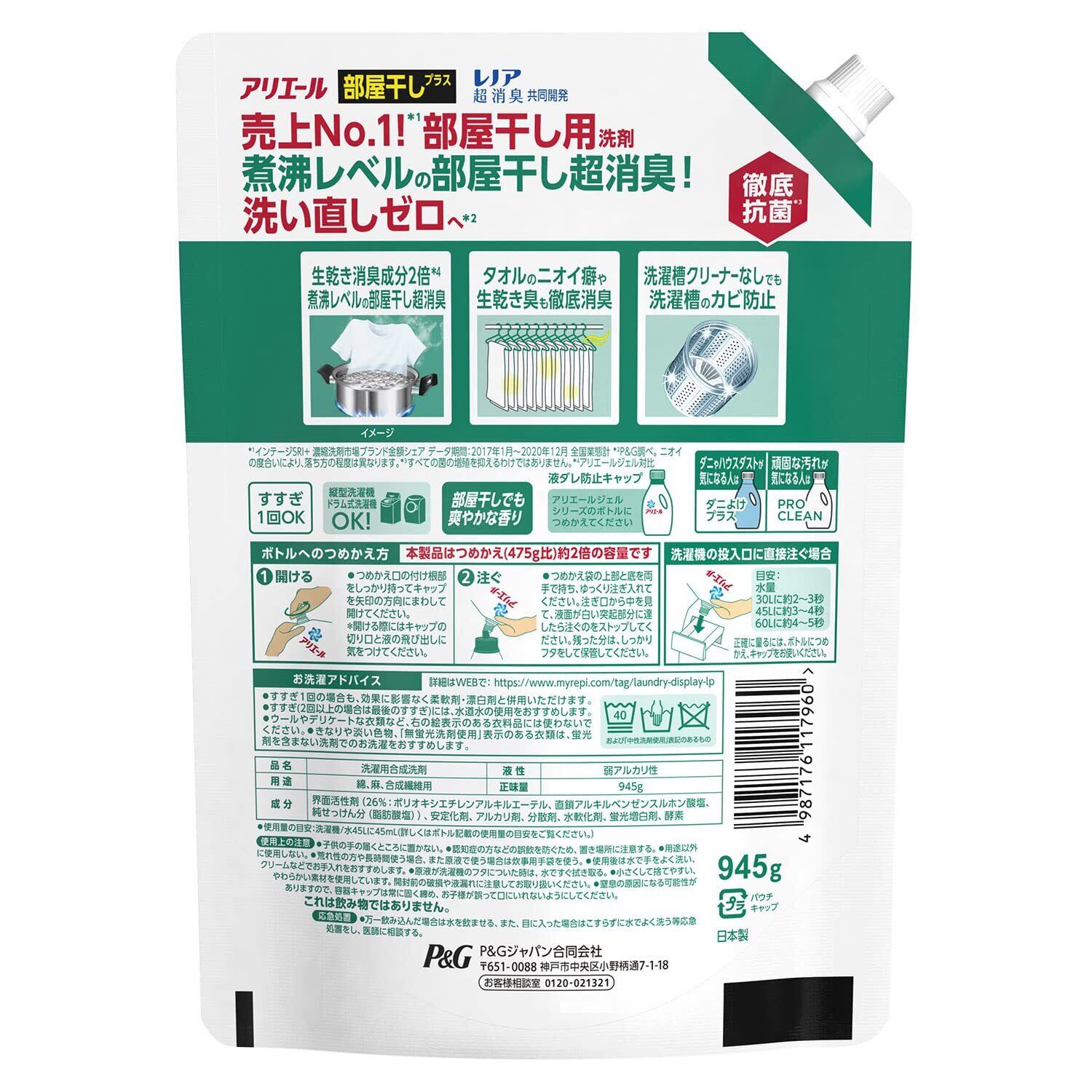 P&G アリエールジェル部屋干しプラス 詰替超特大 945g