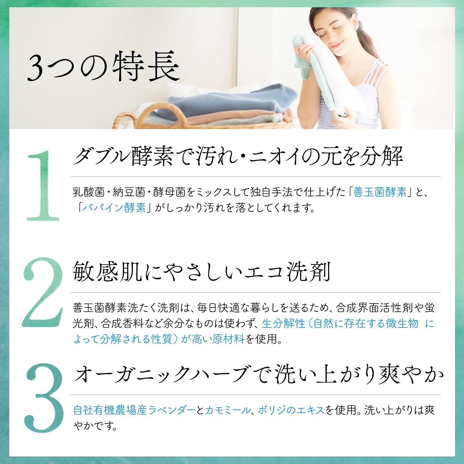 合成界面活性剤ゼロ!ときくと、汚れは落ちるのかと心配になるかもしれません。でも大丈夫。乳酸菌・納豆菌・酵母菌をミックスして独自手法で仕上げた「善玉菌酵素」がしっかり汚れを落としてくれます。