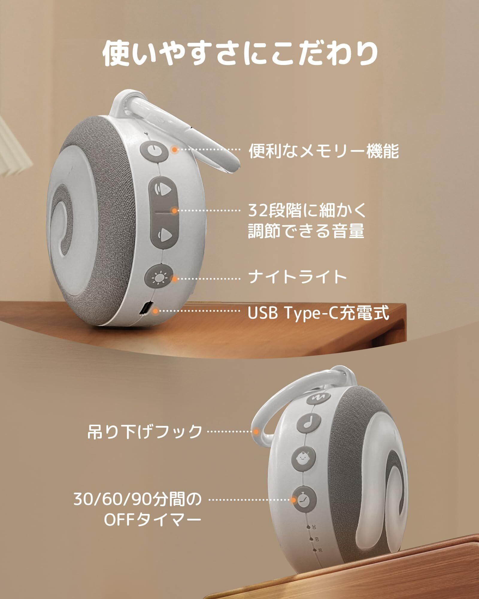 【新しいアップグレード:11種➜21種癒しサウンドに増加(2024/6/24から)】多種類の癒やし自然音(海の波打ち、川のせせらぎ、睡眠オルゴール1、睡眠オルゴール2、「すーすー」の音、ドライヤー動作音、母の胎内音、市場の音、虫の鳴き声) が用意し、ホワイトノイズとファン音も備えています。赤ちゃんの寝かしつけおもちゃとして大活躍してくれるだけでなく、自宅でも各種な雰囲気を創造でき、睡眠改善・集中力アップ・騒音対策・耳鳴り緩和になることに役に立ちます。