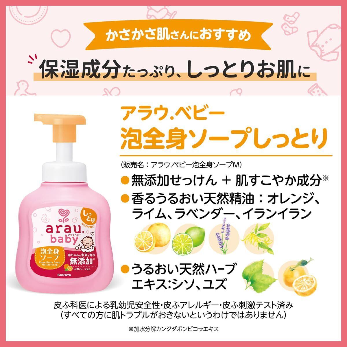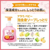 赤ちゃんの頭(髪)から足先まで全身洗える泡全身ソープ。きめ細やかでなめらかな泡が肌をやさしく包み込み、すこやかな肌に導きます。「赤ちゃんの未来を育む」ための独自処方で、肌ストレスの原因となる洗浄成分を残さず、肌本来のうるおいを守ります。オレンジのアイコンが目印の「アラウ.ベビー 泡全身ソープ しっとり」は天然の保湿成分をたっぷり配合し、「かさかさ肌」さんにおすすめ。香るうるおい天然精油「オレンジ&ラベンダー」、うるおい天然ハーブエキス「シソ葉&ユズ」を配合。
