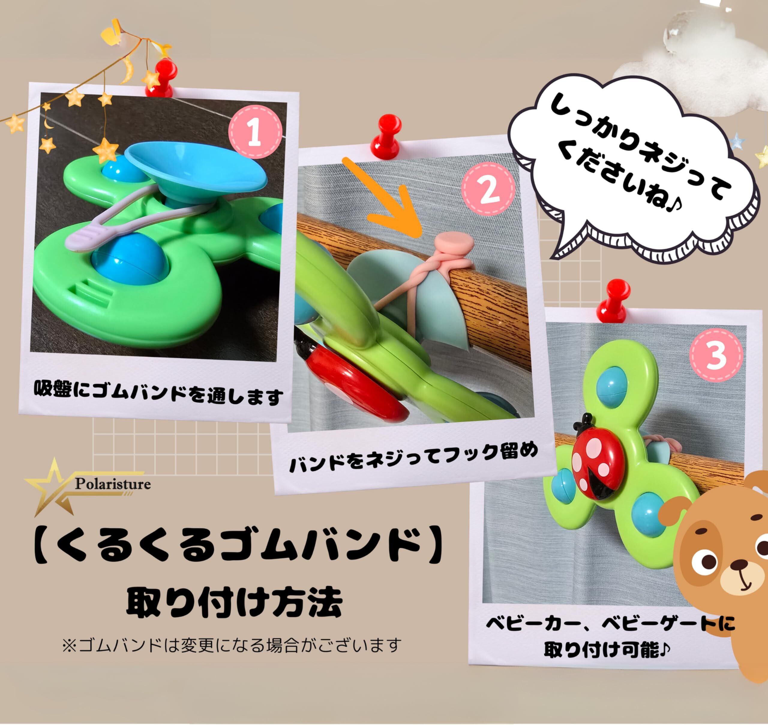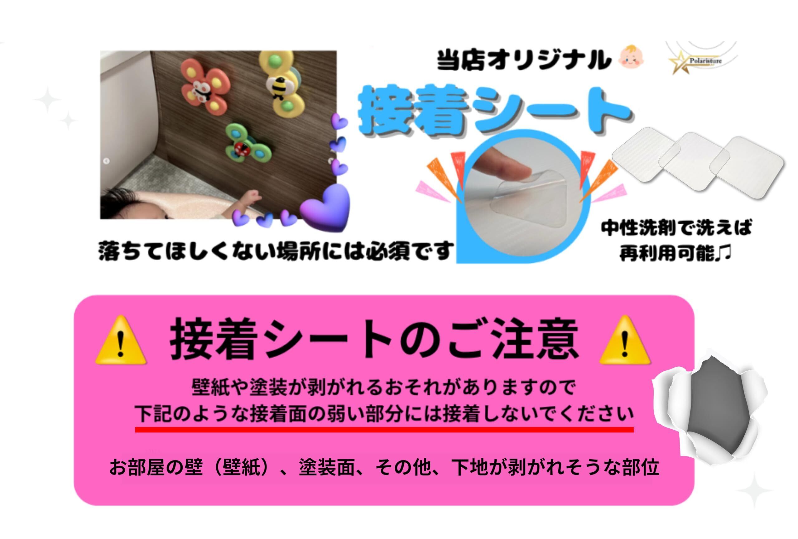 ️吸盤のデザインを採用し、お風呂場や窓やテーブルに装着することができます。使わない時は取り外すこともできるので清潔で安心です。 ️赤ちゃんの安全面を考え、吸盤は何日も耐えるものにはなっておりません。遊んだあとは吸盤を外して保管してください。吸盤の付きが悪い場合は、吸盤を水で少し濡らすと付きが良くなります。