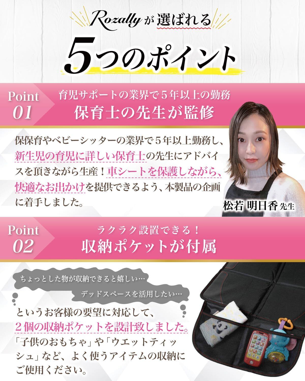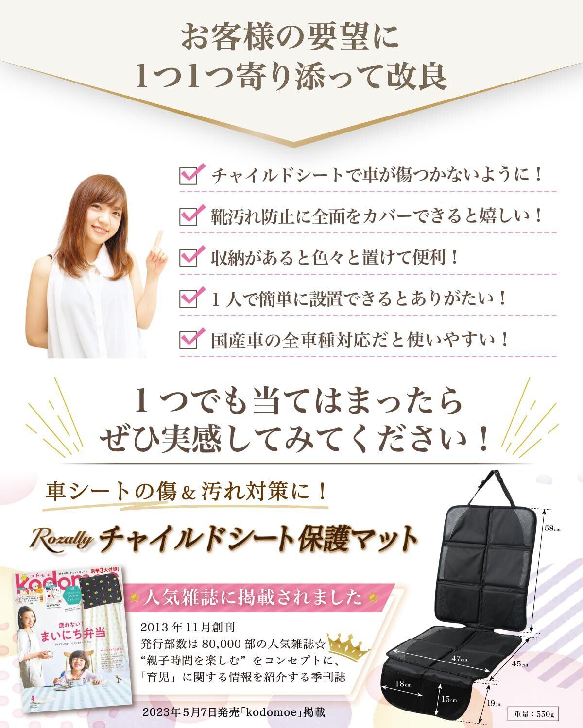 【保育士が監修】 Rozally チャイルドシート 保護マット がついに正式販売開始。 「チャイルドシート の設置で 車 の シートカバー が傷つく…」というお客様の声から生まれた ISOFIX対応 の 座面シート (座面カバー) で 凹み防止 & 汚れ防止 を実現する チャイルドシートマット (保護シート) です。 チャイルドシート や ジュニアシート での”傷防止”や”傷 保護”設置をメインターゲットに ISOFIX 対応 という設計で チャイルドシート保護マット を企画させて頂きました。 企画&設計では 新生児 や 乳幼児 の育児に詳しい【保育士】の先生からアドバイスをもらい、 チャイルドシート 保護マット の簡単設置方法 などフルイラスト説明書として添えさせて頂きました。