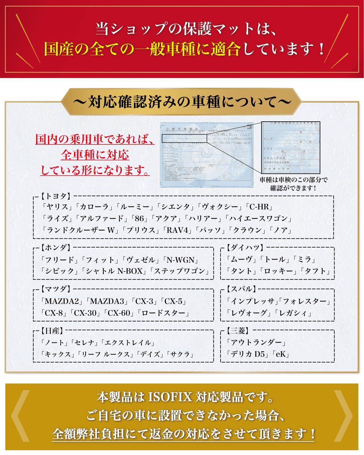 【対応の車種一覧2】 の商品では ISOFIX対応 となっていることから、 国産車の全てに対応している形で企画しています。 設置できない場合がありましたら、 返金の対象となりますので、 お気軽のショップまでお問い合わせください。 ※お問い合わせでよく頂く車種に関して、 下記に一覧として記載をさせて頂きます。 【ダイハツ】 ロッキー、トール、ムーヴ、タント、ミラ、タフト 【スバル】 インプレッサ、フォレスター、レヴォーグ、レガシィ 【三菱】 アウトランダー、デリカD5、eK 【レクサス】 NX350H