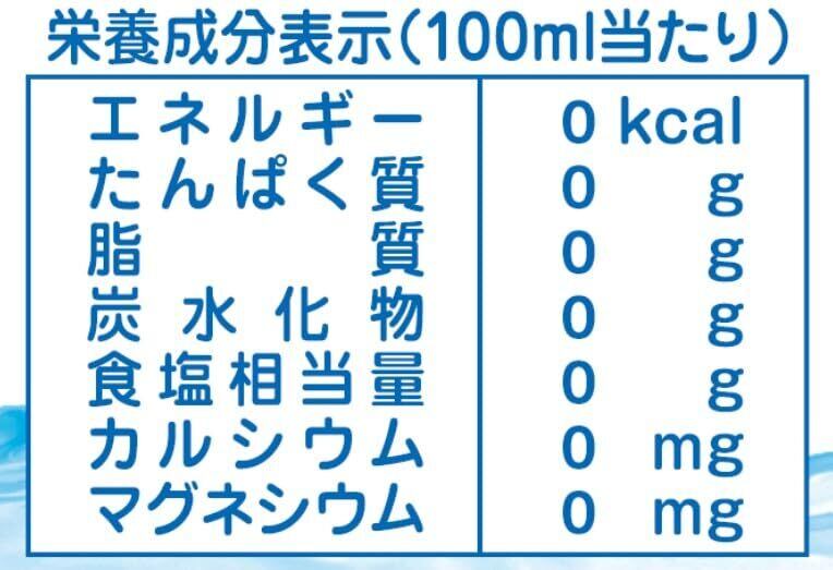 100ml 当たり エネルギー0kcal たんぱく質(g) 0 脂質(g) 0 炭水化物(g) 0ナトリウム(mg)0カルシウム(mg)0マグネシウム(mg)0
