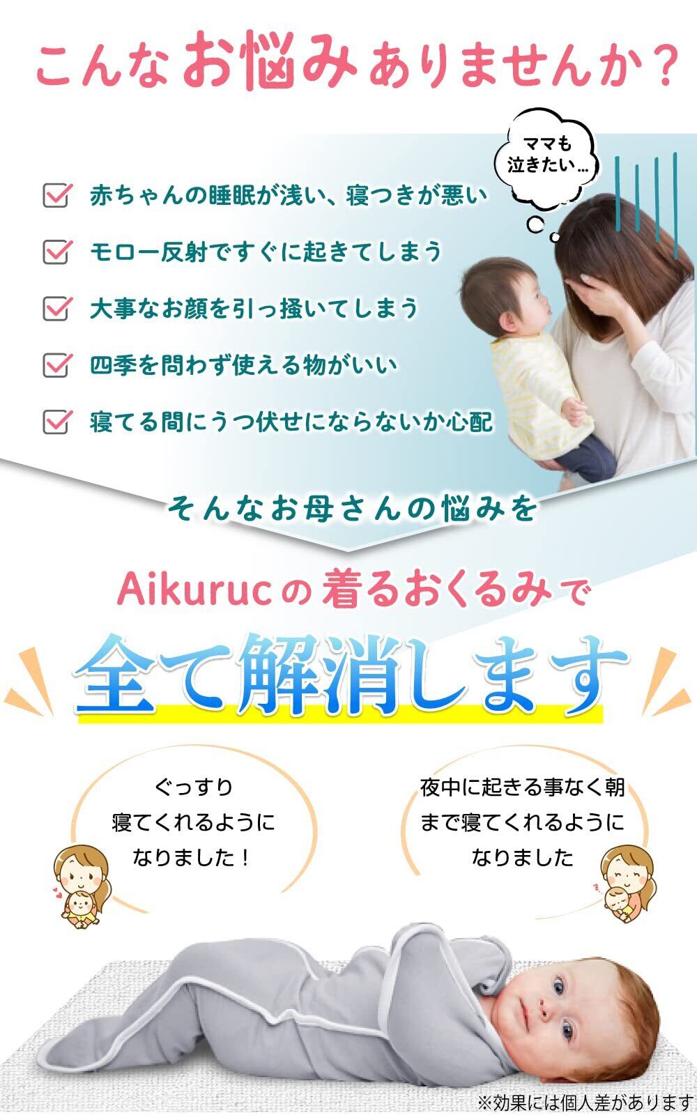 【赤ちゃんに安定した睡眠を】当社の着るおくるみは赤ちゃんの睡眠を妨げる『モロー反射』を落ち着かせる効果があり、新生児の良質な睡眠に役立つといわれています。ママの子宮の中の居心地を再現したデザインになっている為、全身を優しく包み込んで赤ちゃんが最も楽な姿勢でぐっすりと眠れます。
