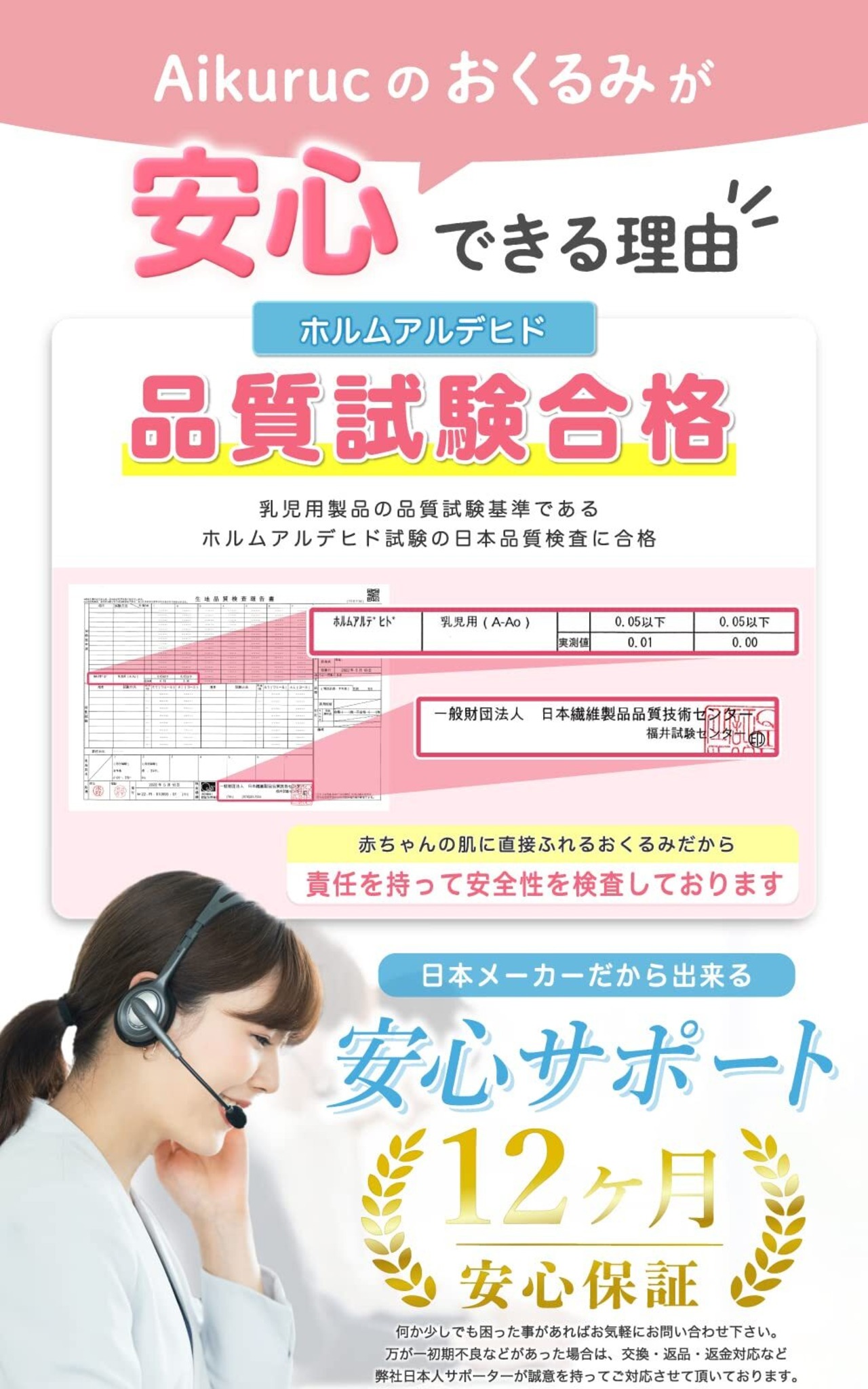 【天然コットン100%】天然コットン100%の素材で出来ており、ホルムアルデヒド国内試験にも合格済み。蛍光剤と漂白剤などの有毒な染料が一切ありませんので、赤ちゃんの肌に直接触れたり、赤ちゃんがお口に入れても健康被害がありません。