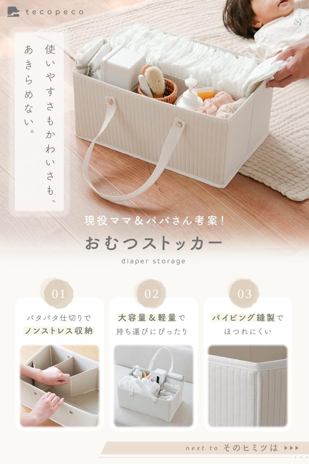 tecopeco オムツストッカー 人気 【ほつれにくい/パタパタ/軽量】おむつストッカー 大容量 車 オムツ 収納 おむつケース ベビー用品 [テコペコ] (アイボリー)