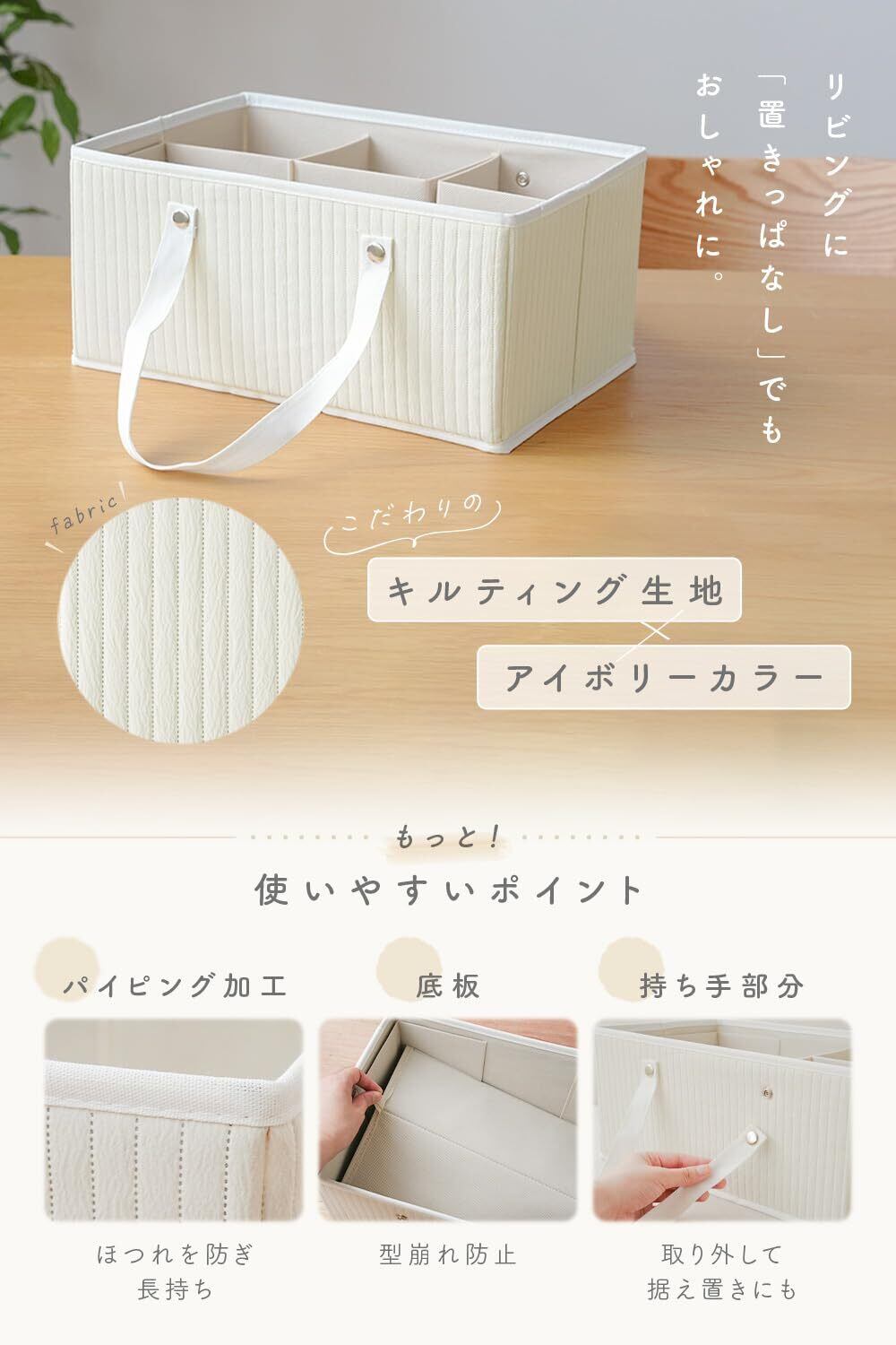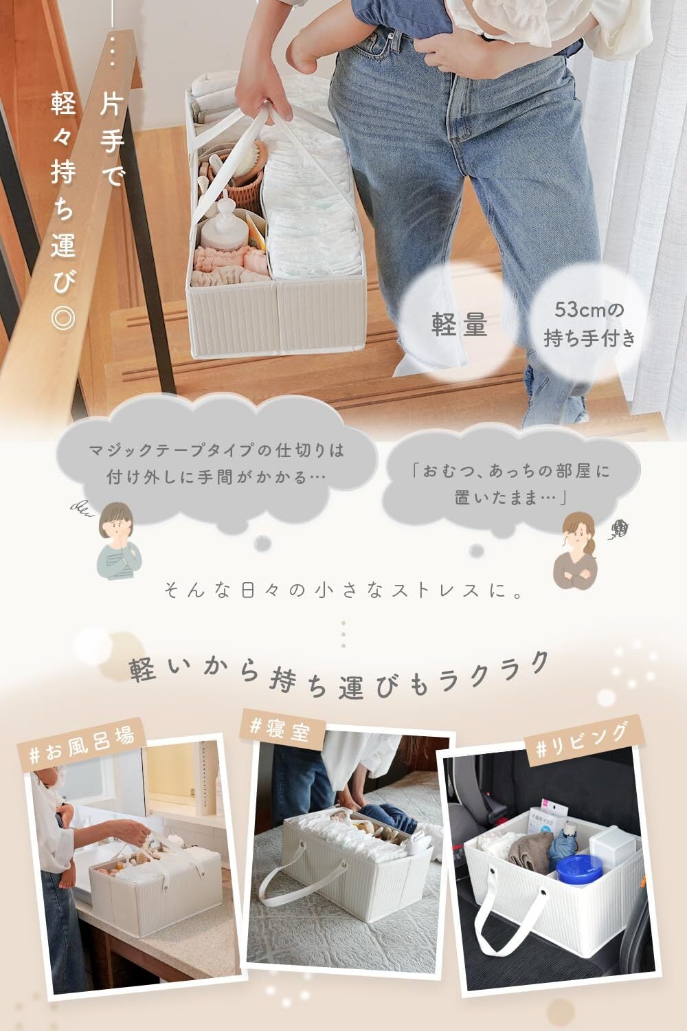 【生活にフィットする自由な使い方】ベビーベッドの横に置いて、さっとおむつ替え。使わないときは、ベビーベッド下にすっきり収納。リビングでのんびり過ごす時間や、お風呂上がりのケアにもぴったり!おむつだけでなく、爪切り・綿棒・保湿アイテムなど赤ちゃん周りのケア用品をひとまとめに収納OK!そのまま持ち運べば、どこでもケアスペースに早変わり◎赤ちゃんとの暮らしに寄り添う、頼れる収納アイテムです