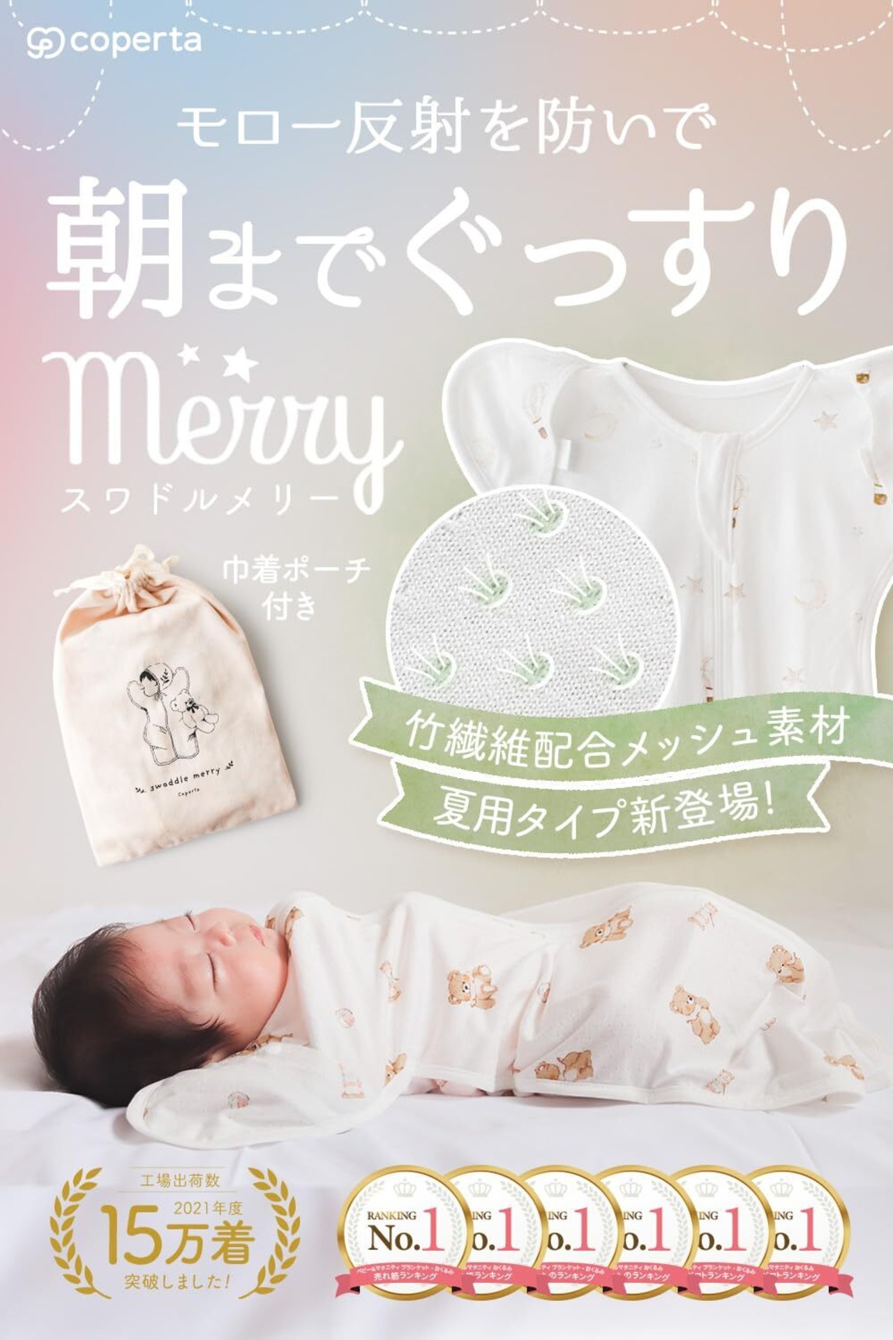 【スワドルメリーとは?】最近SNSなどで話題のスワドルとは、ママの子宮の中の居心地を再現したデザインになっているおくるみのことで、コペルタのスワドルメリーをお使いいただけると、全身を優しく包み込んで赤ちゃんが最も楽な姿勢でぐっすりと眠れます。さらに、赤ちゃんの睡眠を妨げる『モロー反射』を落ち着かせる効果があり、新生児の良質な睡眠に役立つといわれています。