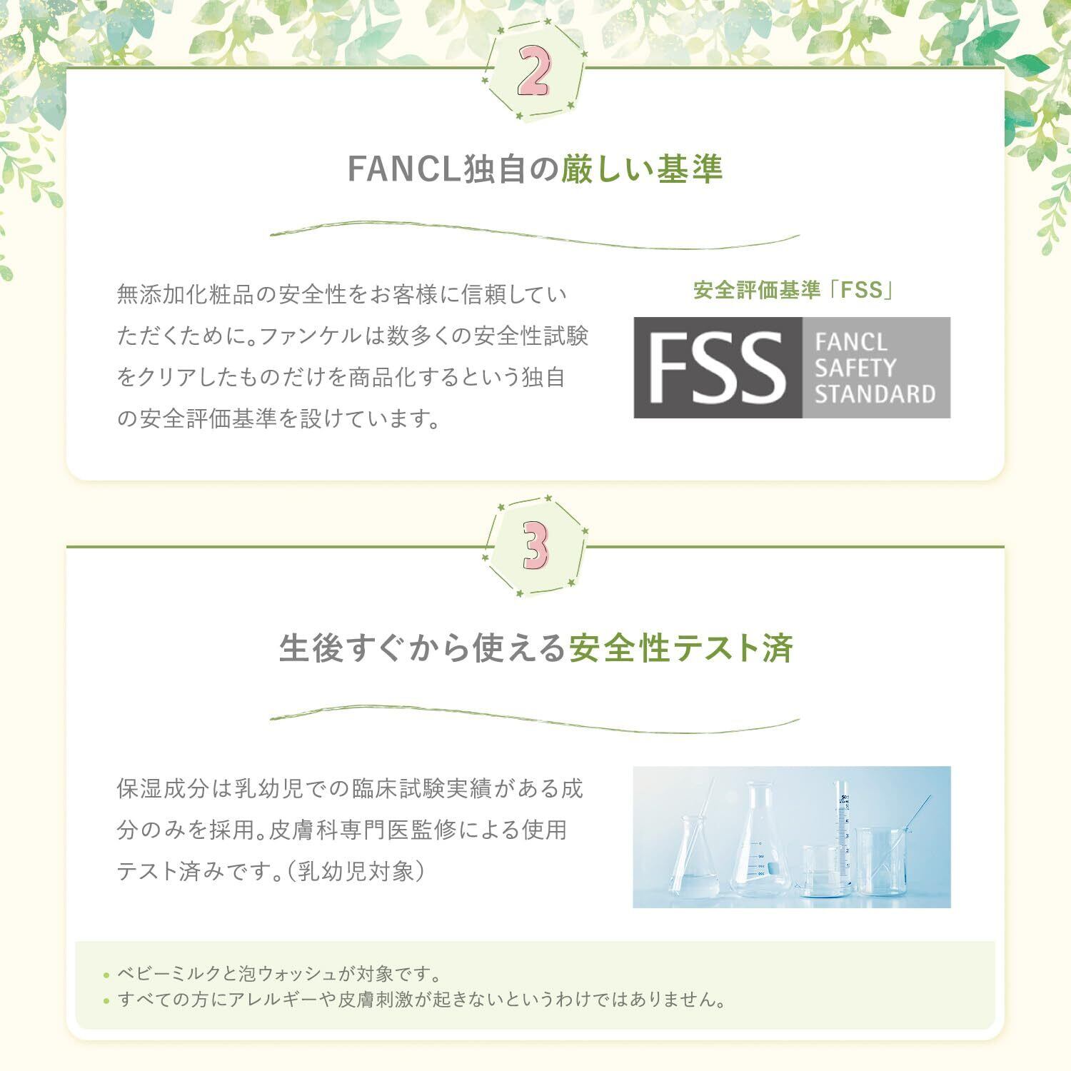 【使用量の目安】 新生児全身洗浄時:3~5プッシュ程(3プッシュで約100回分/5プッシュで約60回分) 【フレッシュ期間】 開封後/120日以内 未開封/3年以内 ファンケルの無添加 │ 防腐剤・合成香料・合成色素・石油系界面活性剤・紫外線吸収剤を一切使っていません。※弱酸性、製造年月日入。 ※皮膚科専門医監修による使用テスト済み(乳幼児対象)。 ※すべての方にアレルギーや皮膚刺激が起きないというわけではありません。