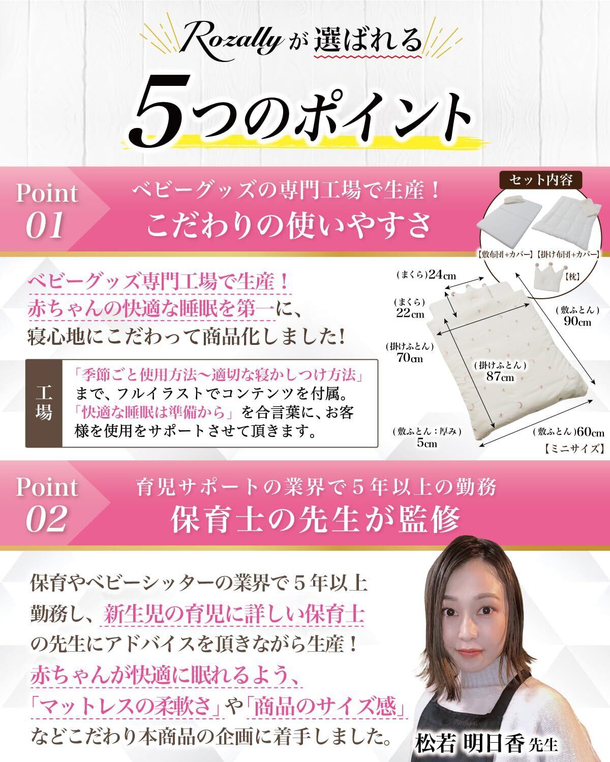 【保育士が監修】 Rozally ベビー布団セット がついに正式販売開始。 「ふかふかな寝心地のベビー布団が欲しい…」というお客様の声から生まれた 「枕」「掛け布団」「敷き布団」「マット」「シーツ」 が1つになったベビー用布団セットです。コンパクトに収納にして 持ち運び 可能な点も人気の1つです。 幼稚園や保育園のお昼寝で必要になる入園アイテムとしても購入頂いております。 企画&設計では 新生児 や 乳幼児 など 子供 の育児に詳しい【保育士】の先生からアドバイスをもらい、衛生的に使えるよう丸洗い可能な素材選定を行いました。 シンプルで可愛いデザインに仕上げたため出産準備や出産祝いなどギフトにも最適になっています。