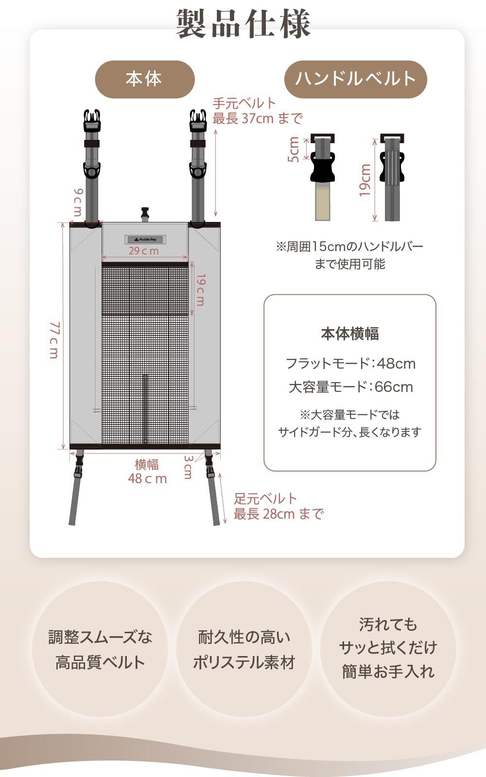 【製品仕様】本体:72cm×48cm(大容量モードでは66cm) 手元ベルト:最長37cm(調整可) 足元ベルト:最長28cm(調整可。輪っかにした場合に最長で約16cmとなります) ハンドルベルト:19cm(周囲15cmのハンドルバーまで使用可能) 重量:350g