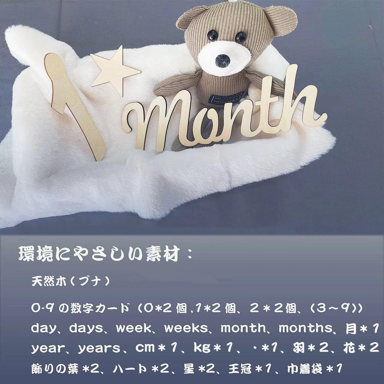 【セット内容】合計36枚、0-9の数字(0*2個、1*2個、2*2個)、day(s)、week(s)、month(s)、飾りの葉*2個、飾りの花*2個、星*2個、ハート*2個、羽*2個、王冠、月、体重測定(kg)、身長測定(cm)があります。また、収納袋付きで利用後の片付けも簡単です。